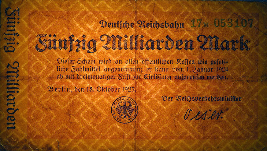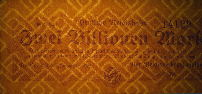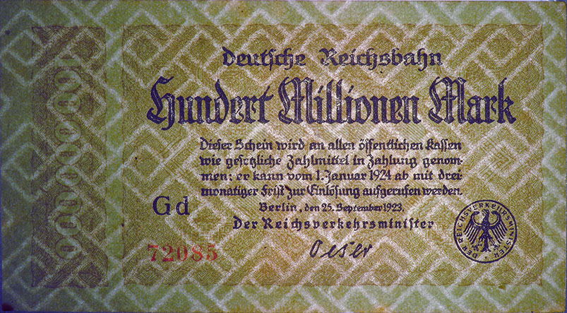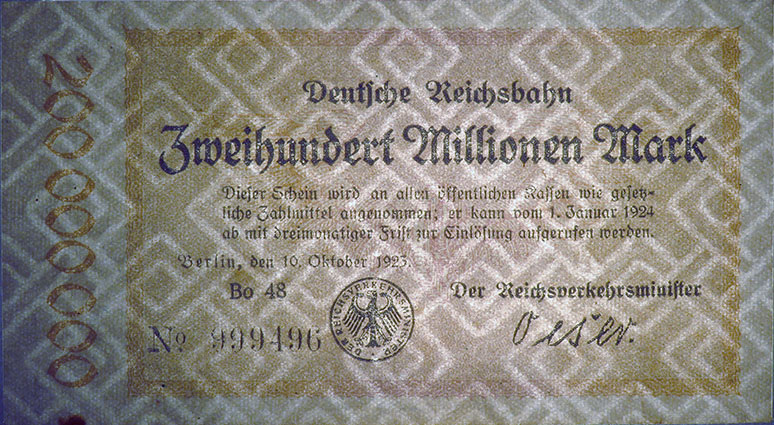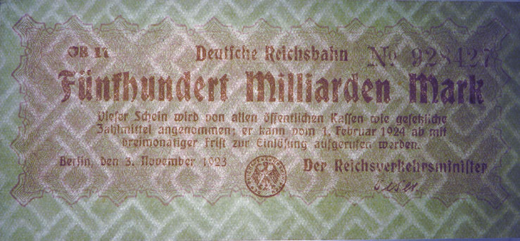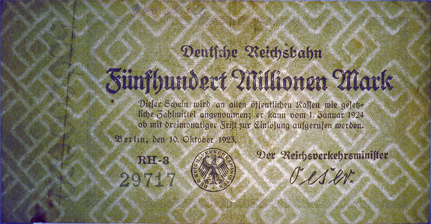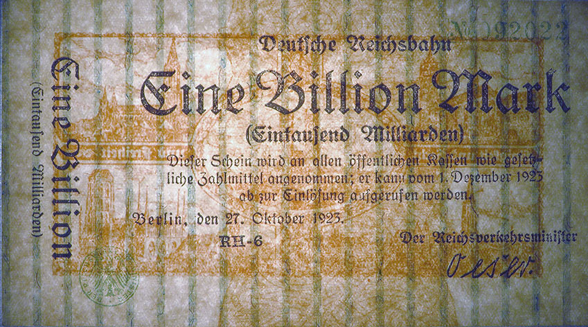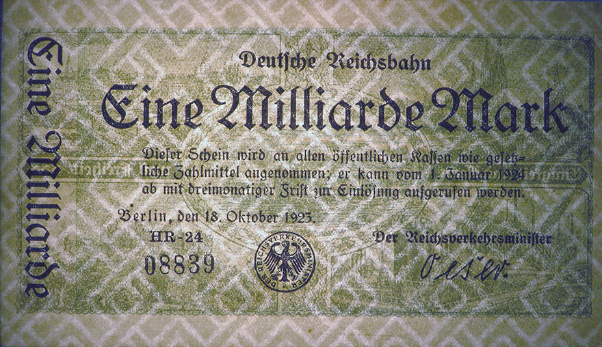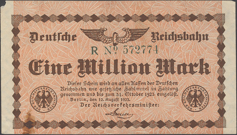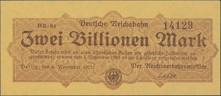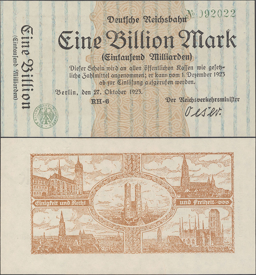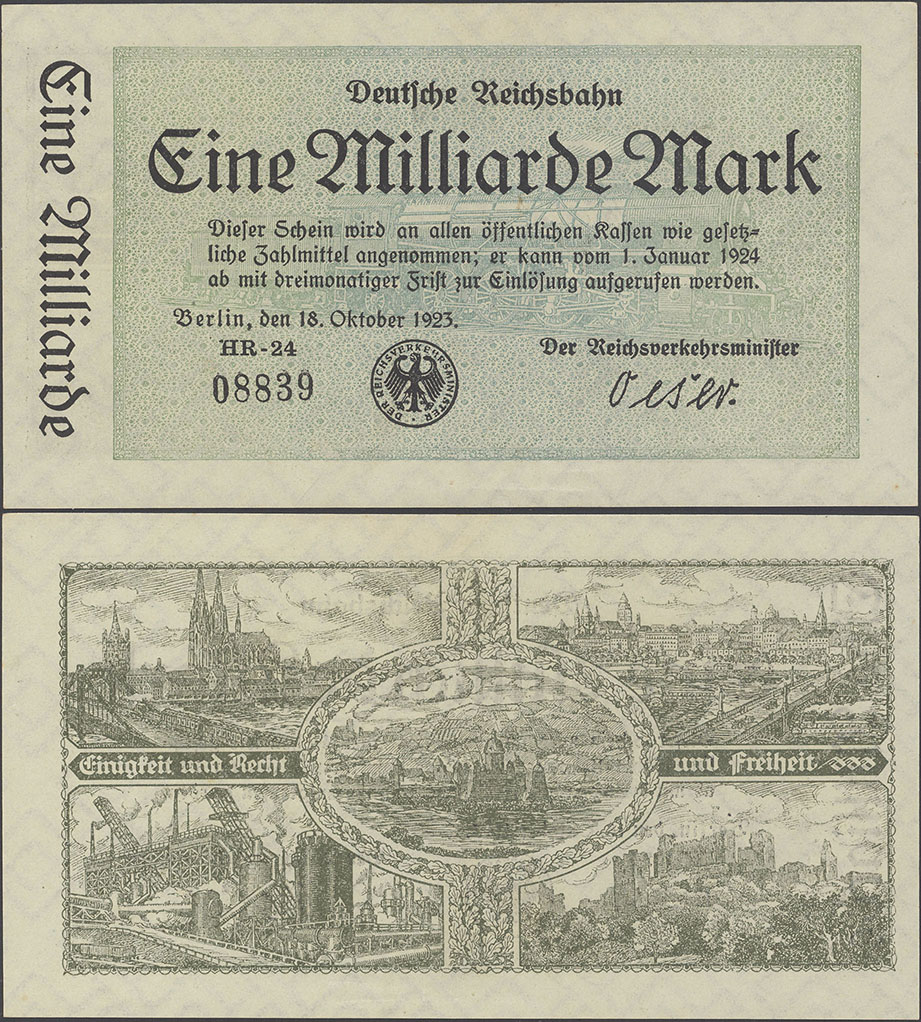 1 Milliarde Mark; 18. Oktober 1923; Grabowski RVM-10. (002.17/S1020); Vs.: Text und Siegel auf Udr. mit Dampflokomotive; Rs.: links oben: Ansicht von Köln mit Dom, rechts oben: Ansicht von Mainz, Mitte im ovalen Eichenlaubrahmen: Burg Pfalzgrafenstein bei Caub/Rhein, links unten: Stahlwerk Rheinhausen, rechts unten: Hambacher Schloß (Maxburg), Mitte: Spruchband "Einigkeit und Recht und Freiheit"; Wz.: verschlungene Quadrate; Kn schwarz |