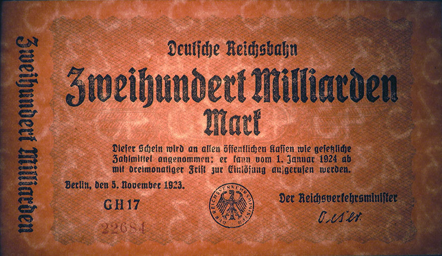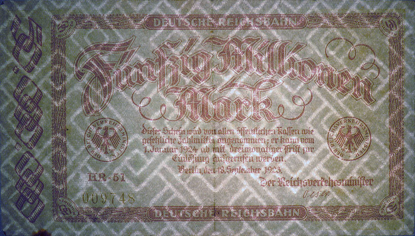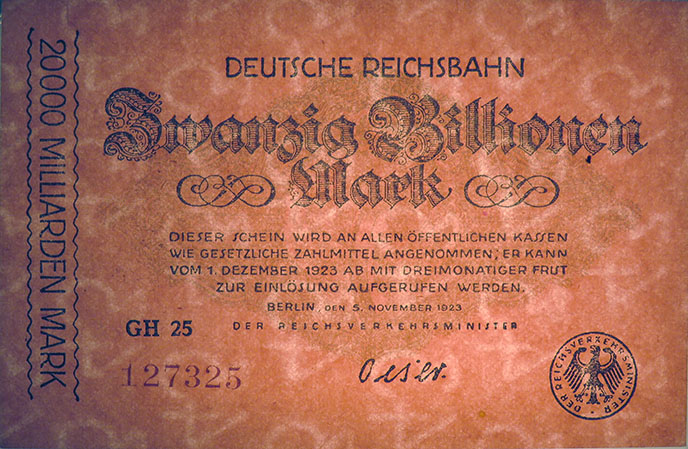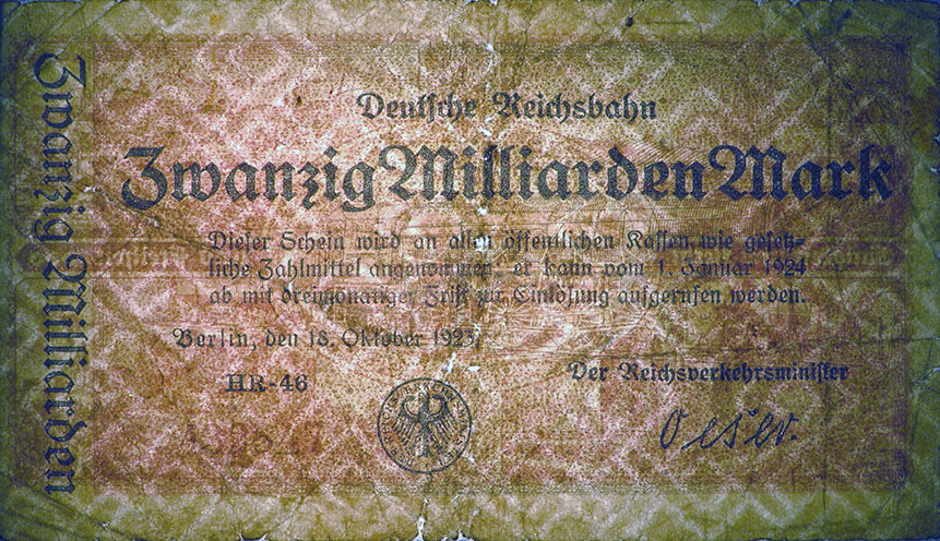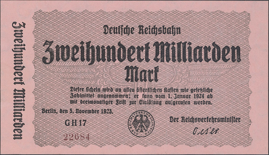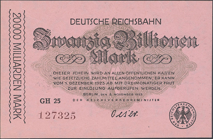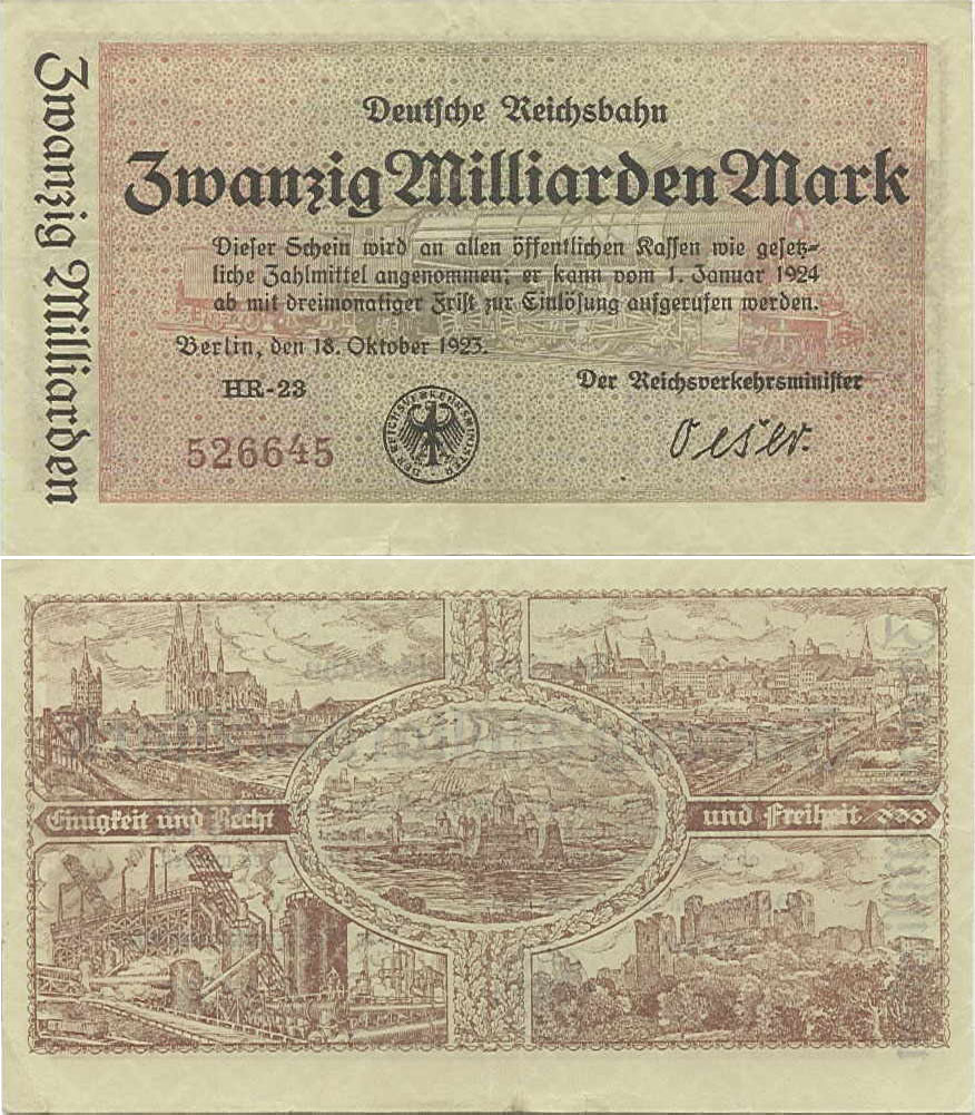 20 Milliarden Mark; 18. Oktober 1923; Grabowski RVM-12.l (002.19/S1022.l); Vs.: Text und Siegel auf Udr. mit Dampflokomotive; Rs.: links oben: Ansicht von Köln mit Dom, rechts oben: Ansicht von Mainz, Mitte im ovalen Eichenlaubrahmen: Burg Pfalzgrafenstein bei Caub/Rhein, links unten: Stahlwerk Rheinhausen, rechts unten: Hambacher Schloß (Maxburg), Mitte: Spruchband "Einigkeit und Recht und Freiheit"; Wz.: verschlungene Quadrate; Kn 6-stellig, FZ: HR |