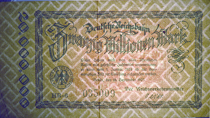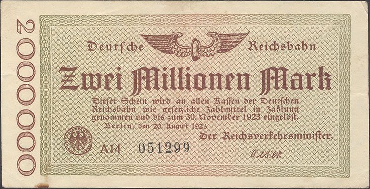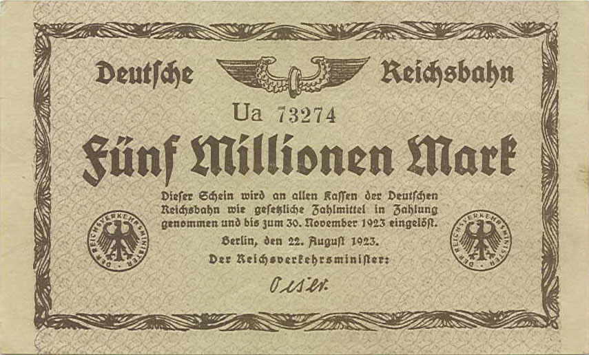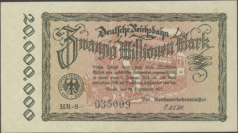 20 Millionen Mark; 18. September 1923; Grabowski RVM-5.a (002.10/S1015.a); Vs.: Text und Siegel auf Udr. mit Dampflokomotive; Rs.: leer; Wz.: verschlungene Quardate |