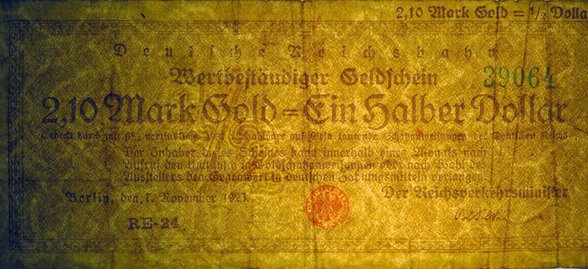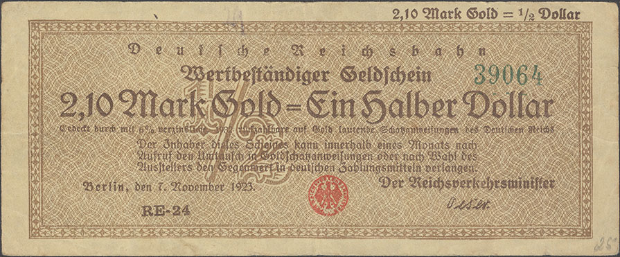 2,10 Mark Gold = 1/2 Dollar; 7. November 1923; Grabowski RVM-28 (002.37/S1037); Vs.: Text und Siegel auf Udr. mit Wertzahl "1/2"; Rs.: leer; Wz.: W-Kreuz-Muster; Kn 5-stellig, grün |