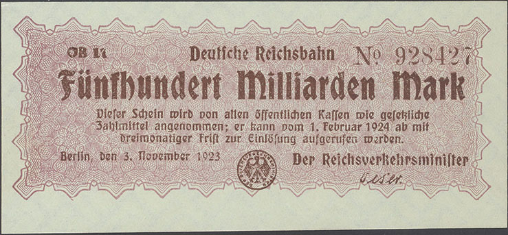 500 Milliarden Mark; 3. November 1923; Grabowski RVM-18 (002.28/S1026); Vs.: Text und Siegel auf Ornament; Rs.: leer; Wz.: verschlungene Quadrate; Kn 6-stellig, braun |