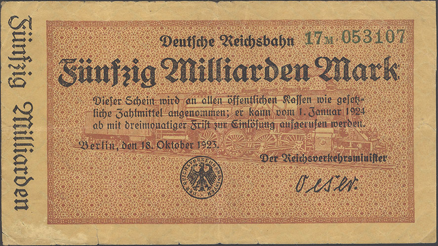 50 Milliarden Mark; 18. Oktober 1923; Grabowski RVM-13 (002.20/S1023); Vs.: Text und Siegel auf Udr. mit Dampflokomotive; Rs.: leer; Wz.: verschlungene Quadrate; Kn 6-stellig, grün; FZ: M |