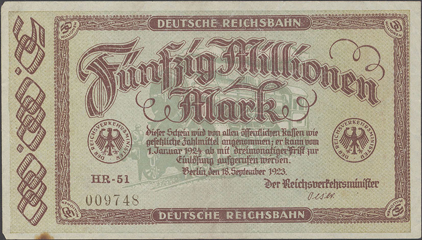 50 Millionen Mark; 18. September 1923; Grabowski RVM-6.a (002.11/S1016.a); Vs.: Text und Siegel auf Udr. mit Dampflokomotive; Rs.: leer; Wz.: verschlungene Quardate |