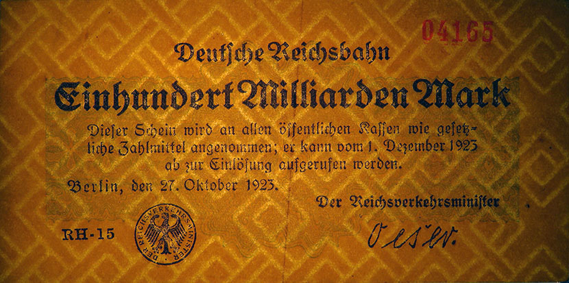 100 Milliarden Mark; 27. Oktober 1923; Grabowski RVM-14 (002.23/S1024); Vs.: Text und Siegel auf Udr. mit Ornament; Rs.: leer; Wz.: verschlungene Quadrate; Kn 5-stellig, rot |