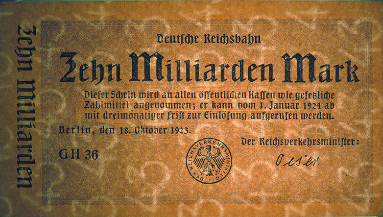 10 Milliarden Mark; 18. Oktober 1923; nicht katalogisiert, sonst wie Grabowski RVM-11i (002.18/S1021); Vs.: Text und Siegel auf Udr. mit Dampflokomotive; Rs.: leer; Wz.: "43"; ohne Kn. |