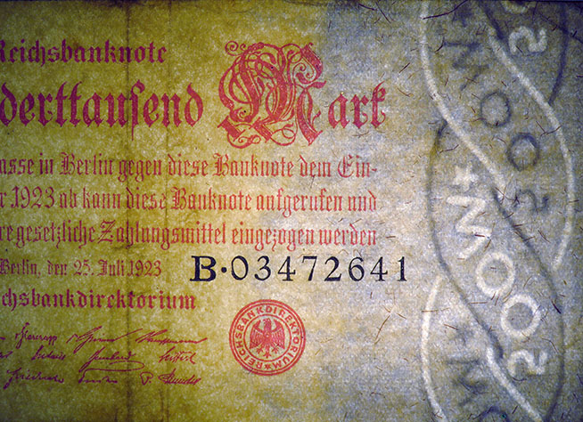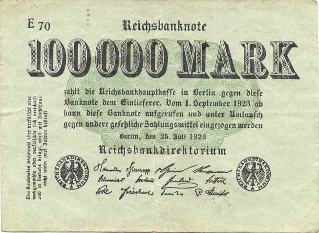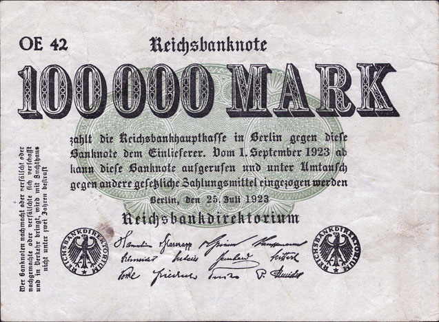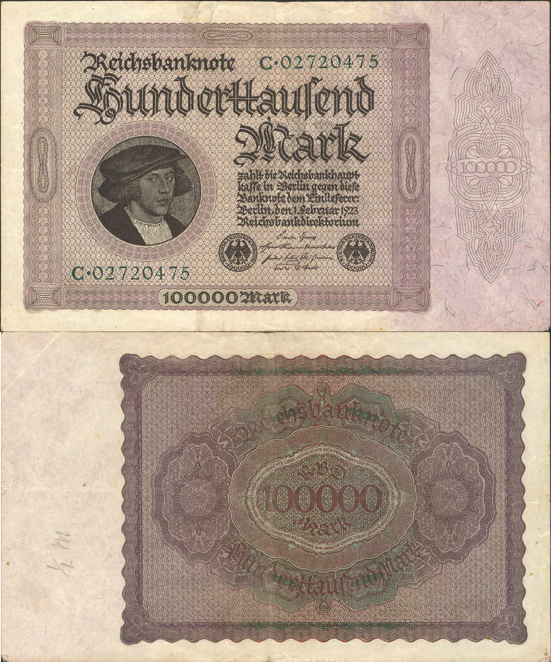 100.000 Mark; 1.2.1923; Grabowski DEU-93.a (82.a); Vs.: Kaufmann Gisze (Gemälde v. H. Holbein); Rs.: Wertziffer auf Ornament; Wz.: Eichenlaubstreifen; Kn. auf der Vs. zweimal; Serien: A-U |