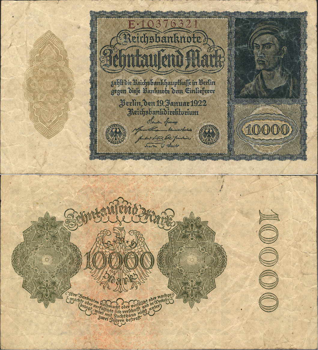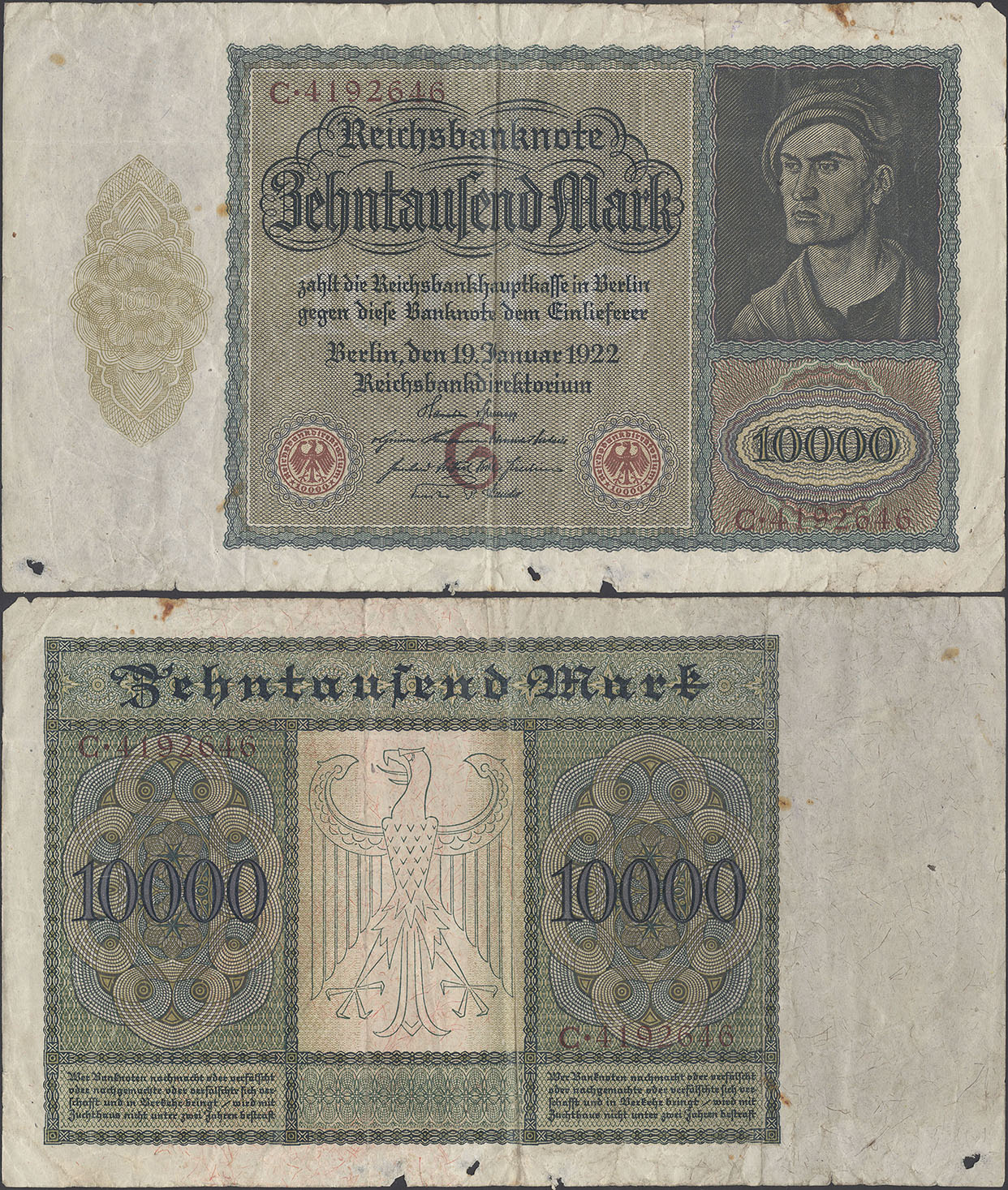 10.000 Mark; 19.1.1922; Grabowski DEU-76 (68.a/P70); Vs.: Junger Mann (Gemälde von Dürer); Rs.: Reichsadler und Ornamente mit Udr.; Wz.: "10000 M" im Spiralband; Udr. G, Serie: C; Kn. 7-stellig, braun |