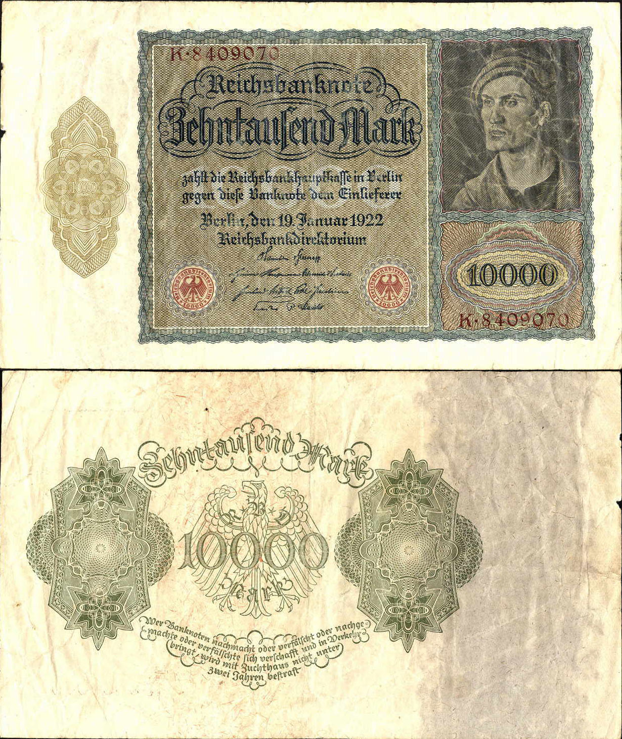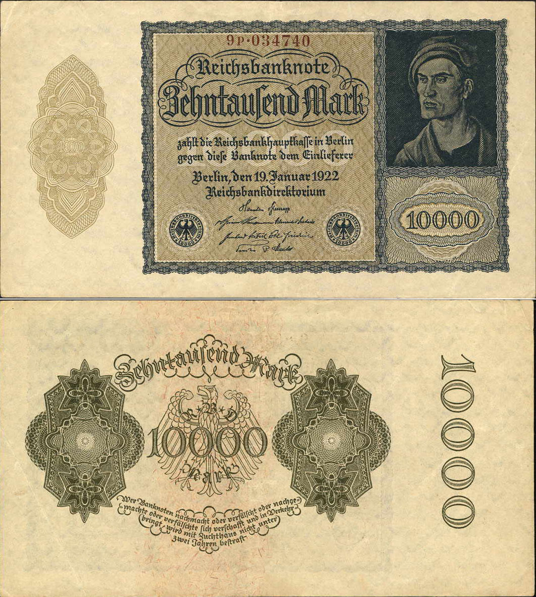 10.000 Mark; 19.1.1922; Grabowski DEU-77 (68.b); Vs.: Junger Mann (Gemälde von Dürer); Rs.: Ornamente; Wz.: "10000 M" im Spiralband; Serie: A; Kn. 7-stellig; ohne Udr.-Bst. |