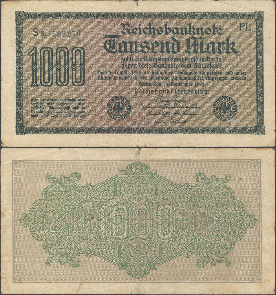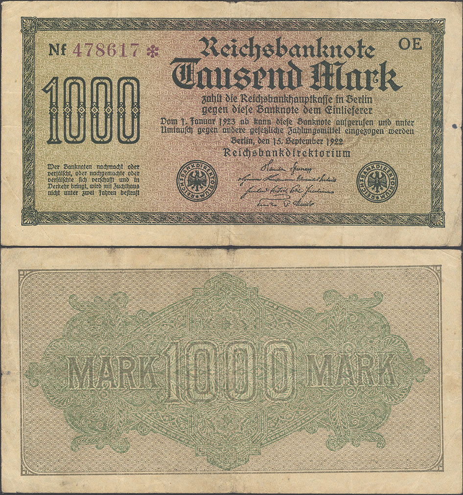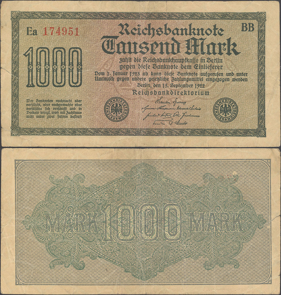 1.000 Mark; 15.9.1922; Grabowski DEU-85 (75.d/P76); nur von Privatfirmen gedruckt; Vs.: WZ und Text im Zierrahmen; Rs.: Wertangabe in Ornamenten; Wz. Dornen; Kn. 6-stellig, rot; FZ: BB, BW, BX, EK, GP, KH, NF, NN, OE, PG, RB, SB, WB, XB |