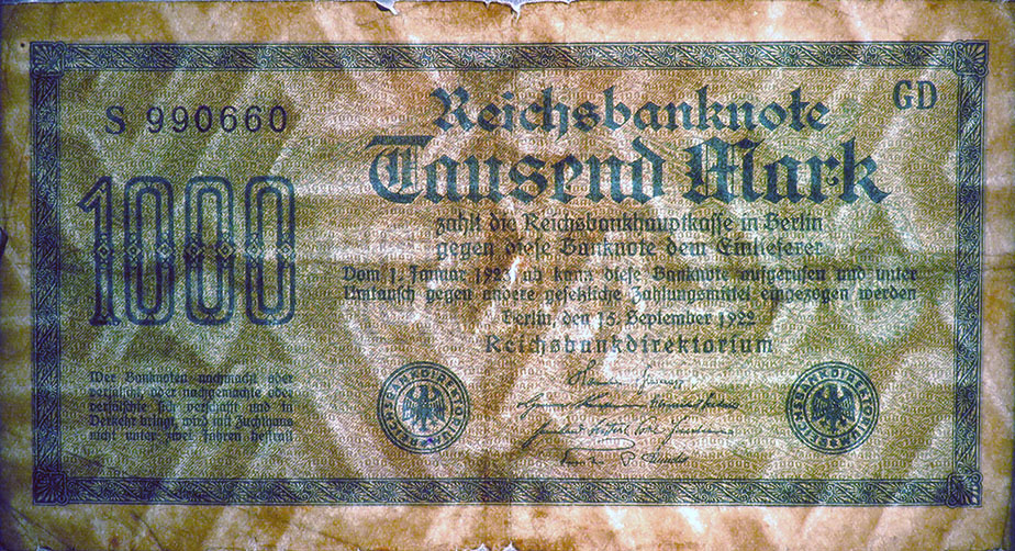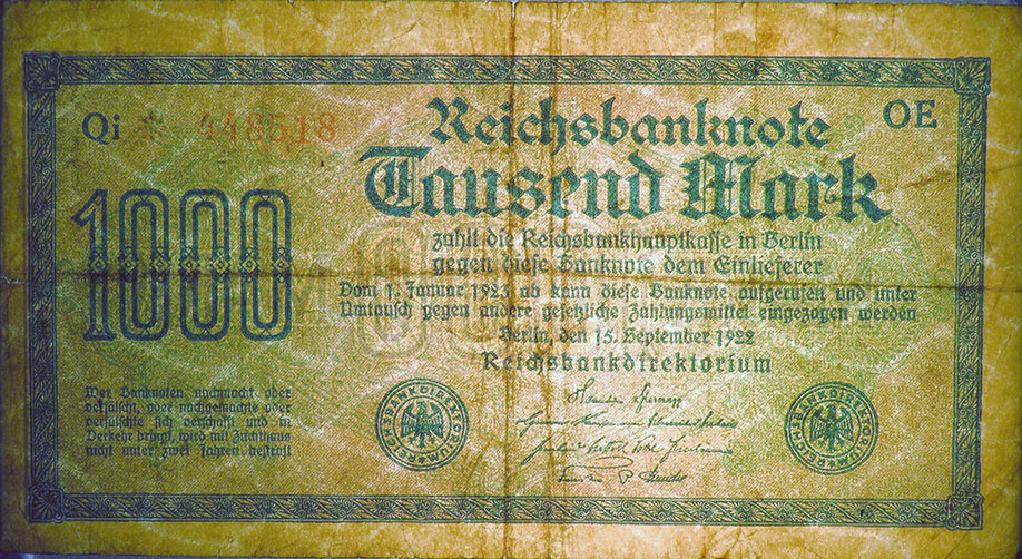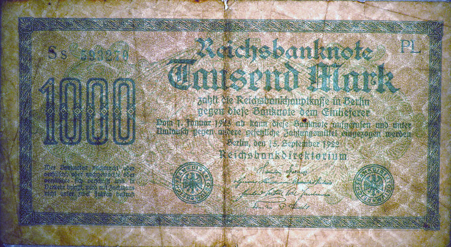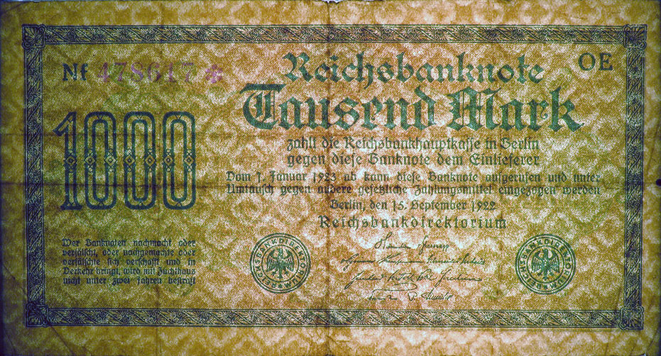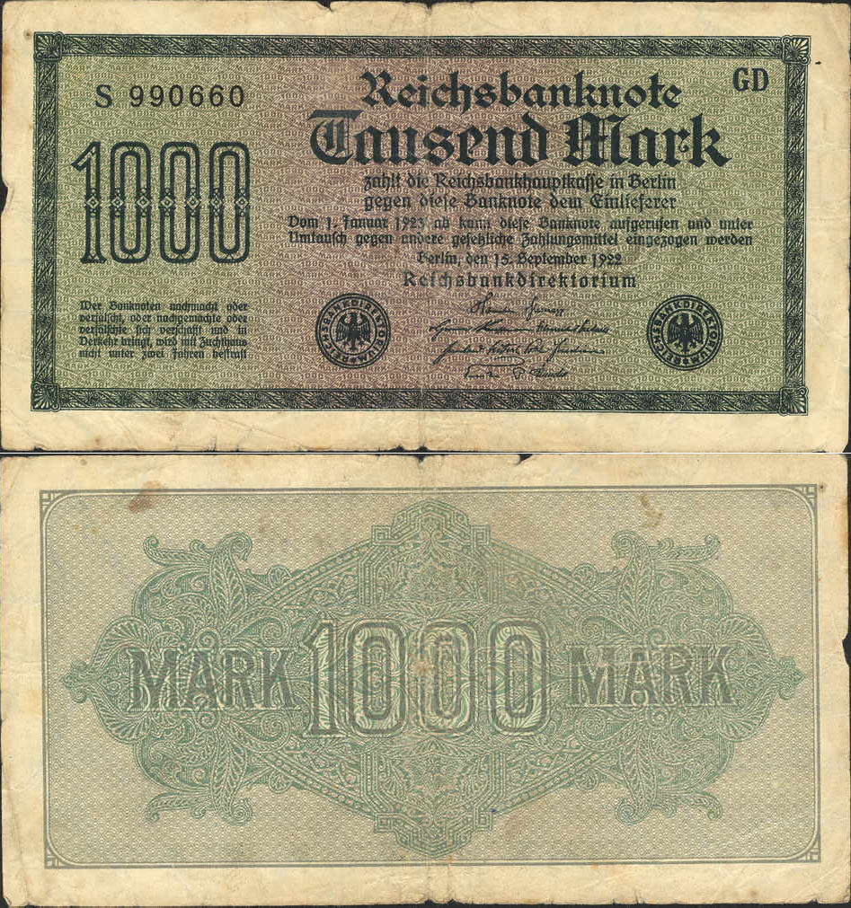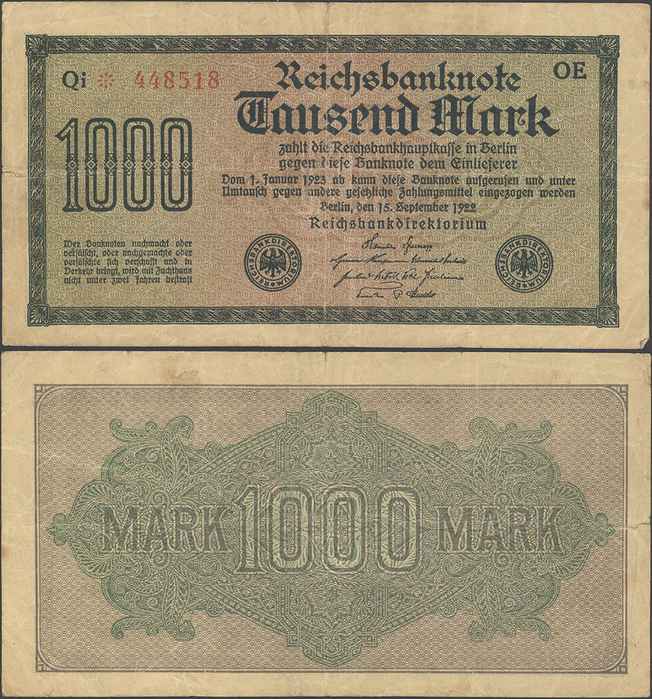1.000 Mark; 15.9.1922; Grabowski DEU-85 (75.d/P76); nur von Privatfirmen gedruckt; Vs.: WZ und Text im Zierrahmen; Rs.: Wertangabe in Ornamenten; Wz. Dornen; Kn. 6-stellig, rot; FZ: BB, BW, BX, EK, GP, KH, NF, NN, OE, PG, RB, SB, WB, XB |
