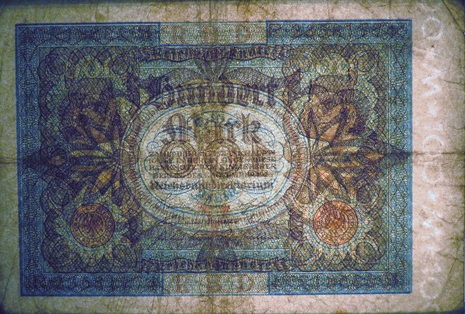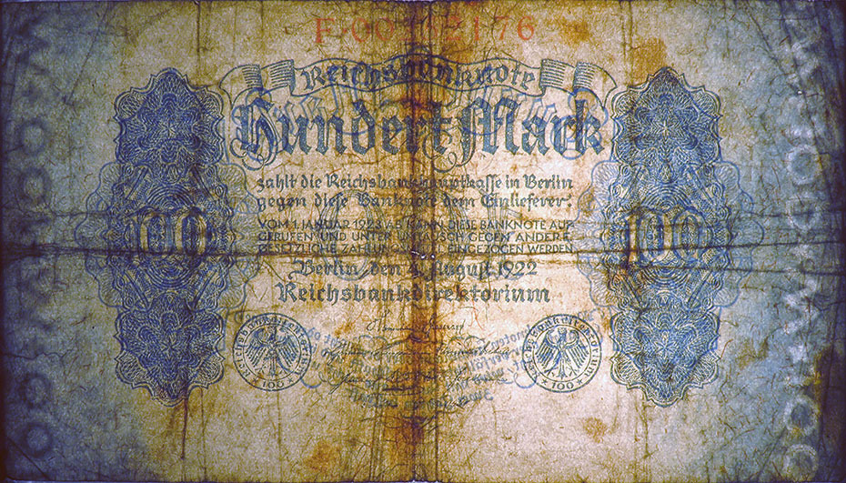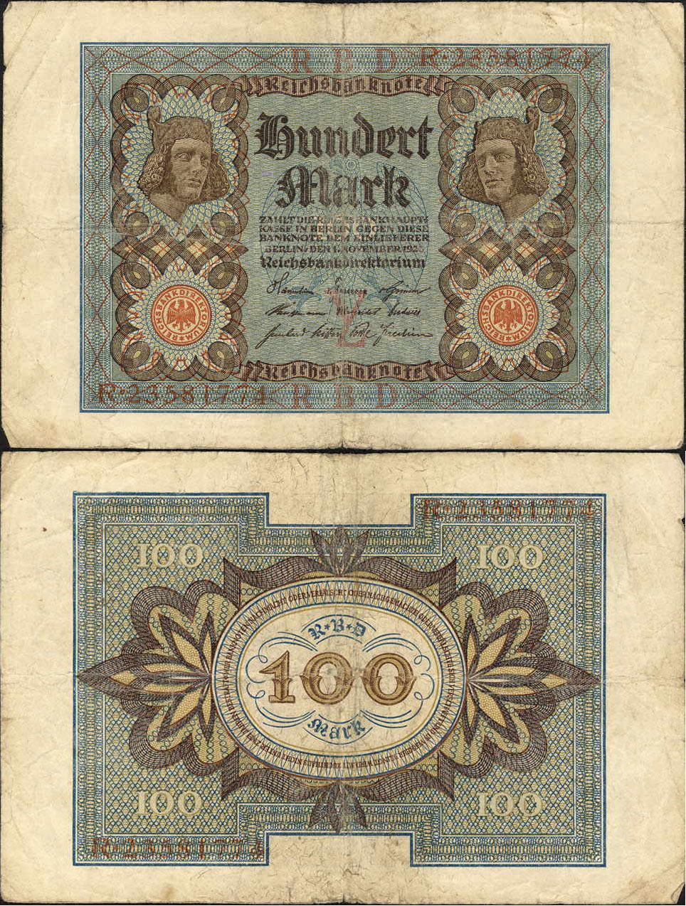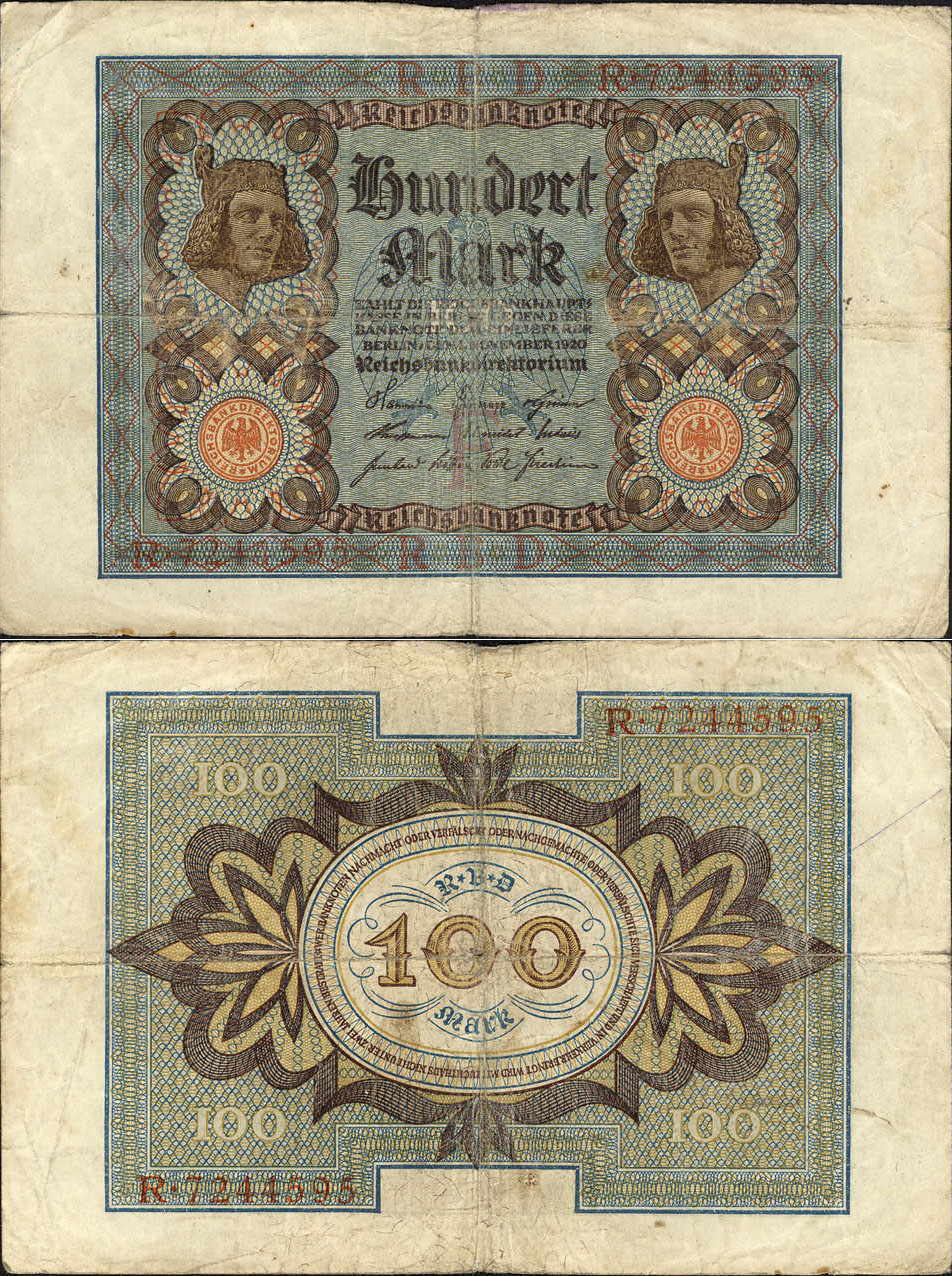 100 Mark; 1.11.1920; Grabowski DEU-75.a (67.a); Vs.: zweimal der Kopf des Bamberger Reiters gegeneinander gesetzt; Rs.: Wertziffer in Ornamenten; Wz.: Wertband "M+100+"; Serien: A-Z; Kn. 7-stellig; Udr.-Bst.: A-H |