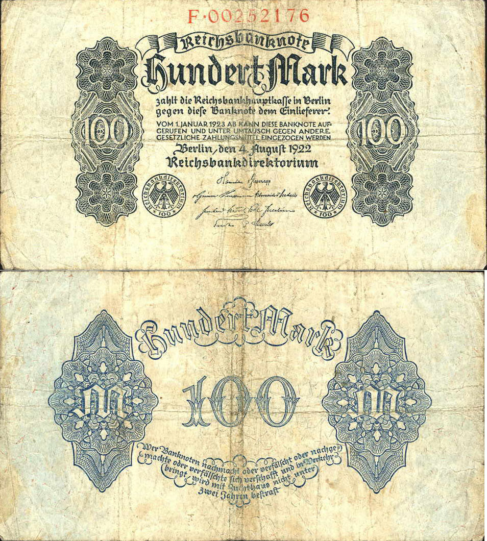 100 Mark; 4.8.1922; Grabowski DEU-83 (72.); Vs. und Rs.: Ornamente; Wz.: "100 M" im Wertband; KN 8-stellig, rot; Serien: A-K |