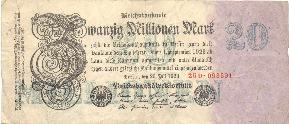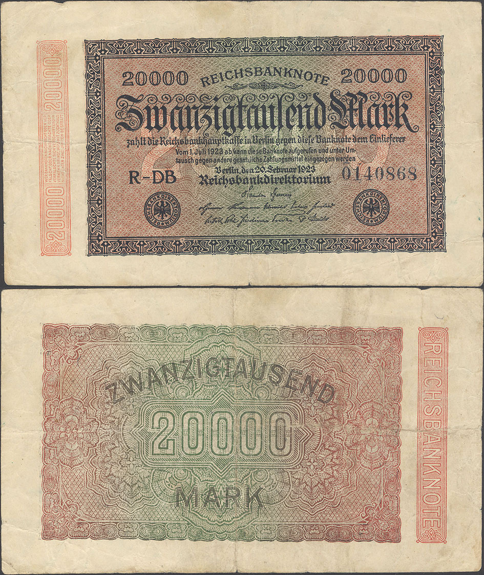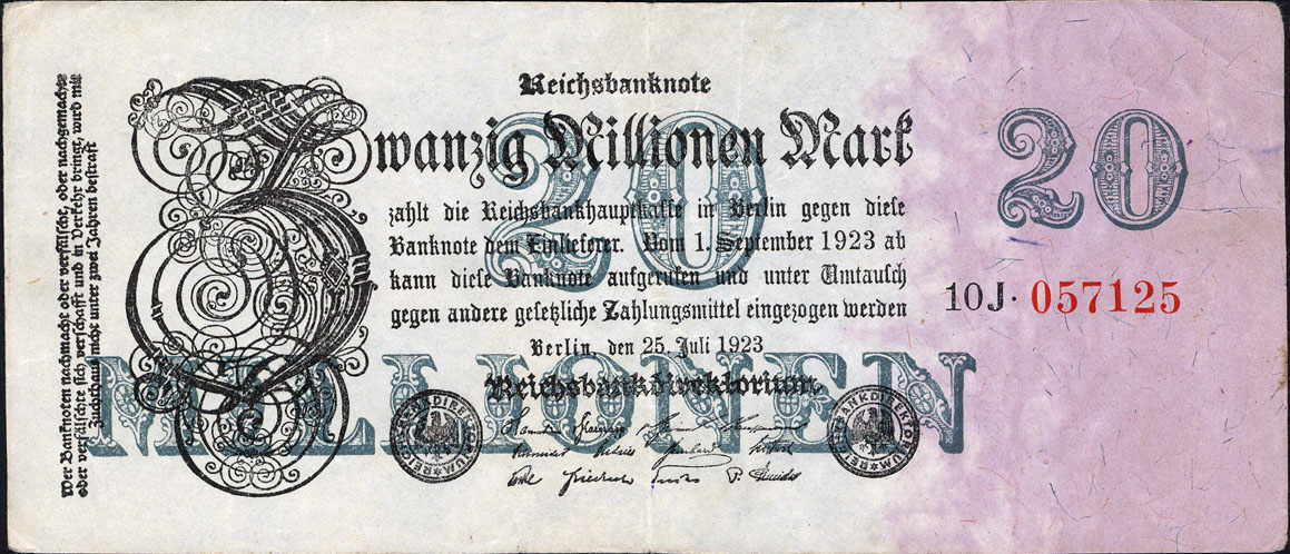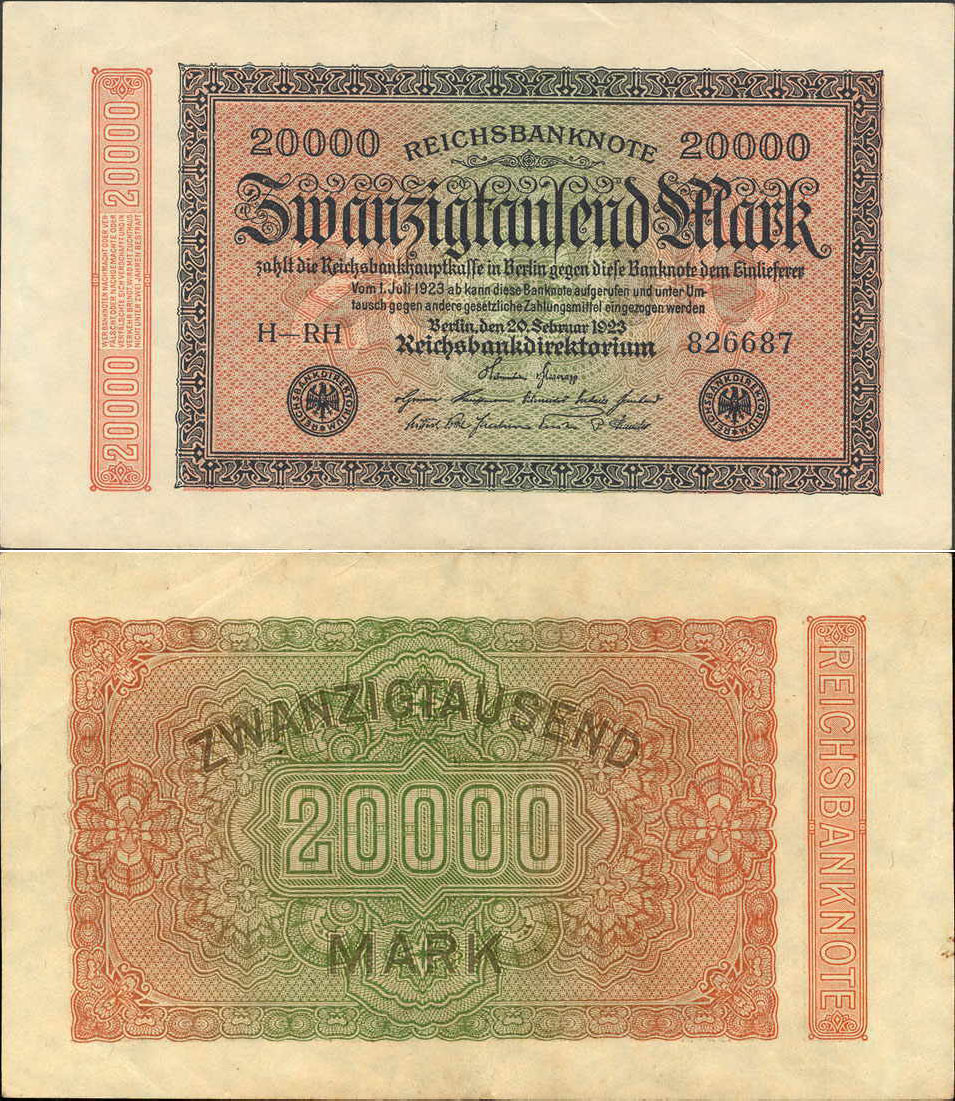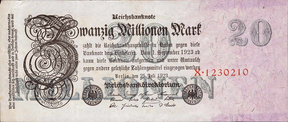 20.000.000 Mark; 25.7.1923; Grabowski DEU-108.a (96.a); Vs.: Text auf Wertangabe im Udr.; Rs.: leer; Wz.: Eichenlaubstreifen; Reichsdruckerei; Kn. 7-stellig, rot; Serien: W, X, Y, Z |