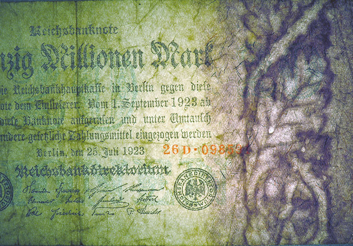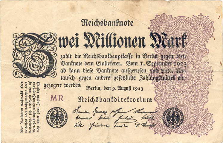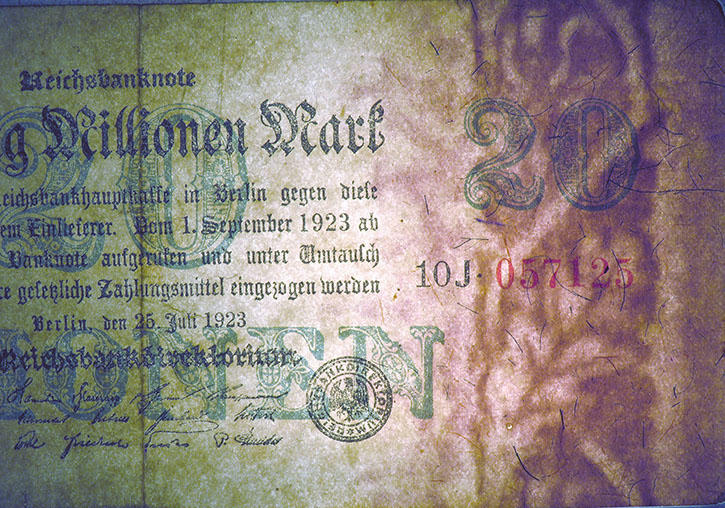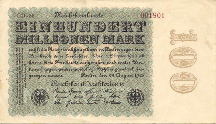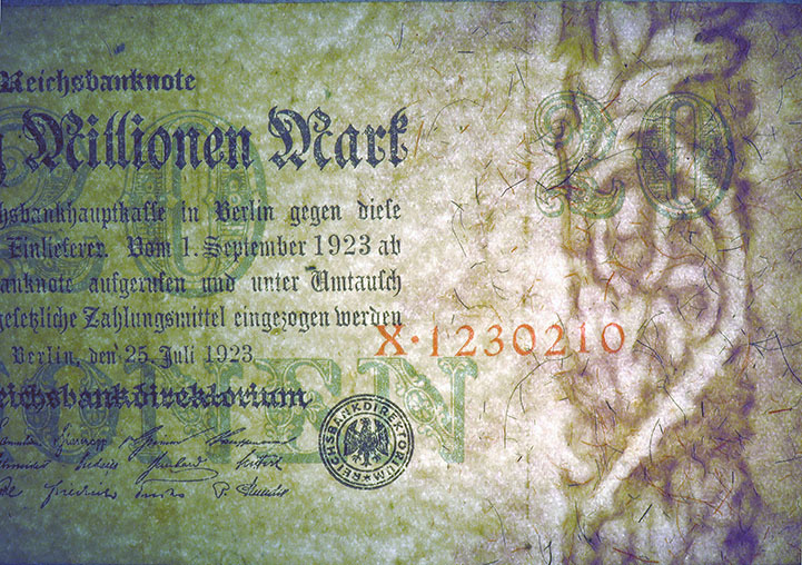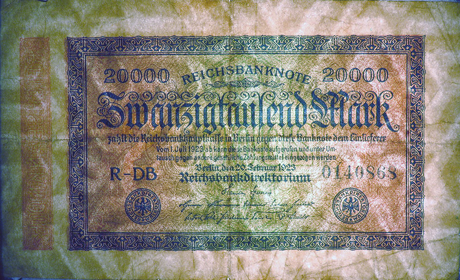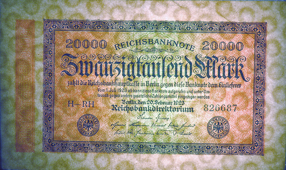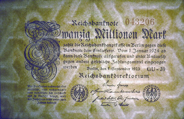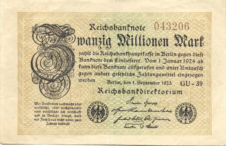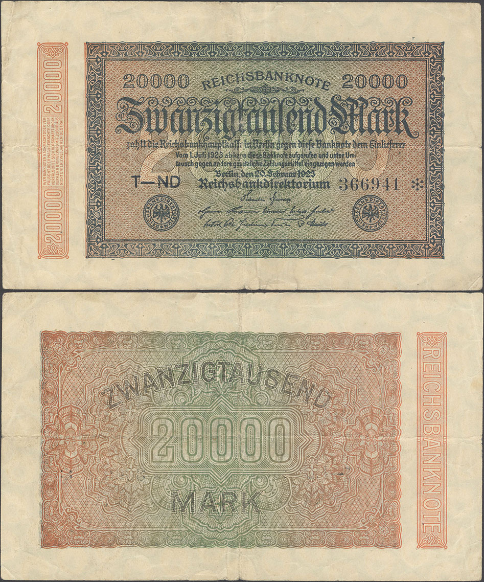 20.000.000 Mark; 25.7.1923; Grabowski DEU-108.a (96.a); Vs.: Text auf Wertangabe im Udr.; Rs.: leer; Wz.: Eichenlaubstreifen; Reichsdruckerei; Kn. 7-stellig, rot; Serien: W, X, Y, Z |