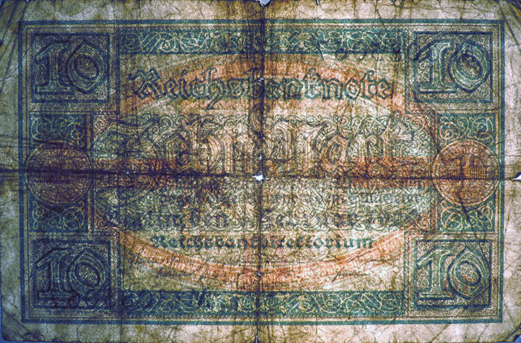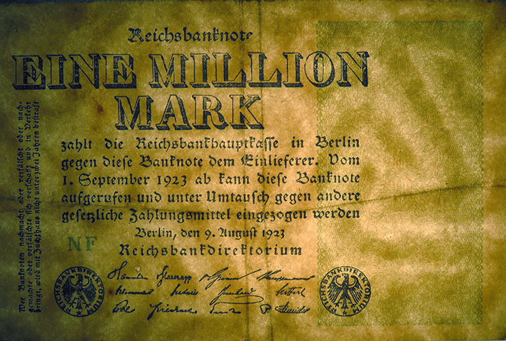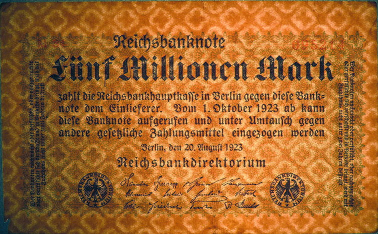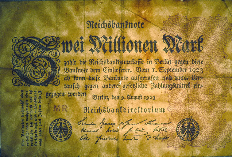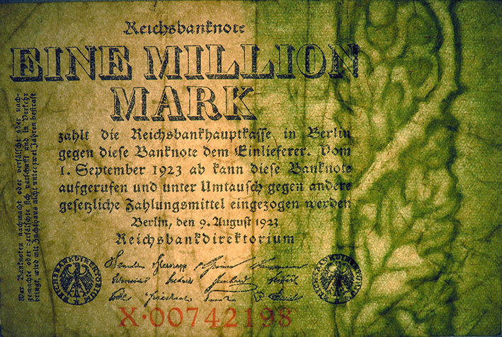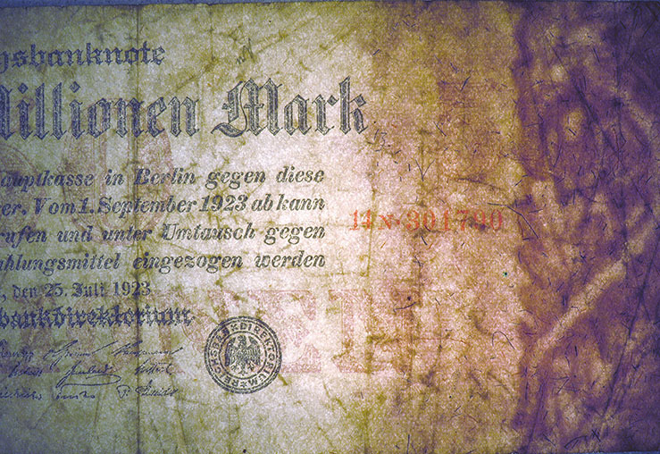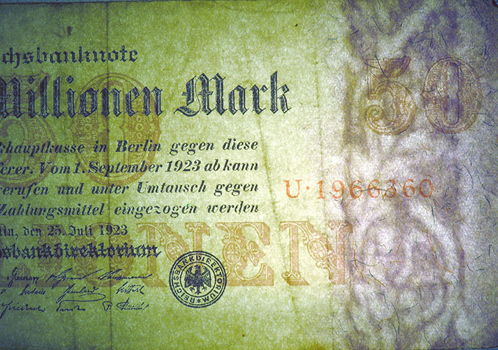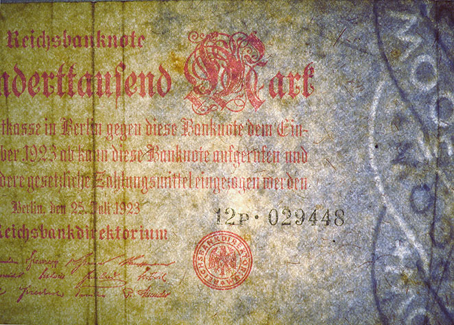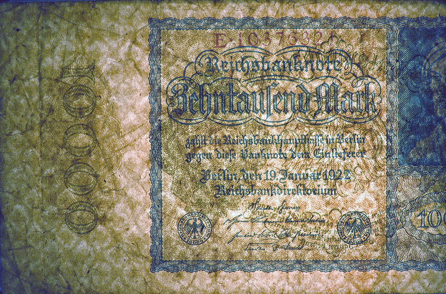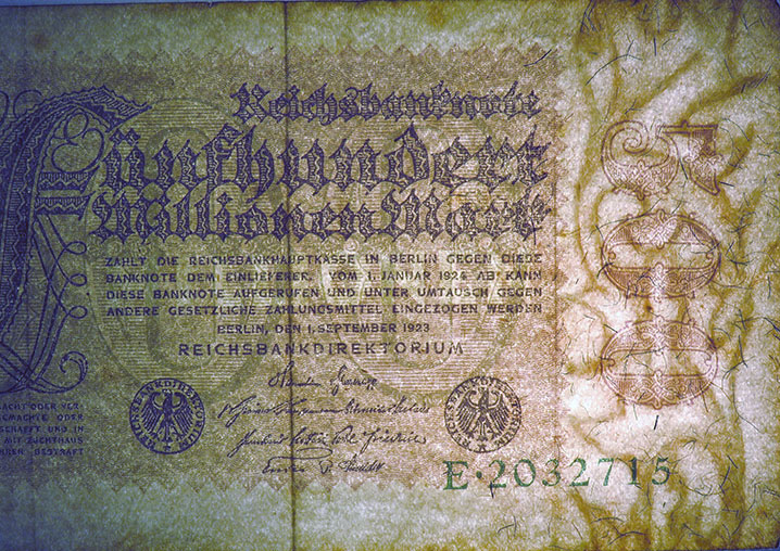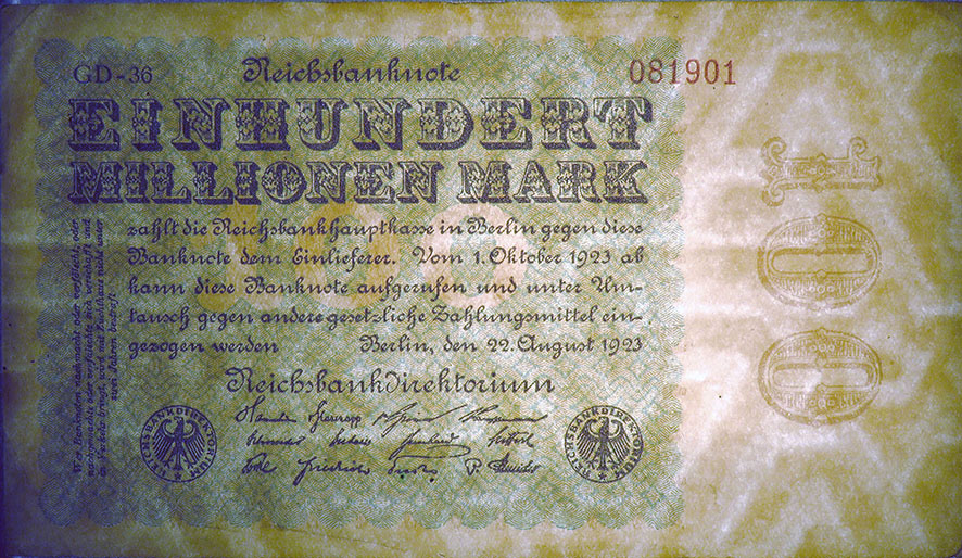 20.000.000 Mark; 25.7.1923; Grabowski DEU-108.a (96.a); Vs.: Text auf Wertangabe im Udr.; Rs.: leer; Wz.: Eichenlaubstreifen; Reichsdruckerei; Kn. 7-stellig, rot; Serien: W, X, Y, Z |