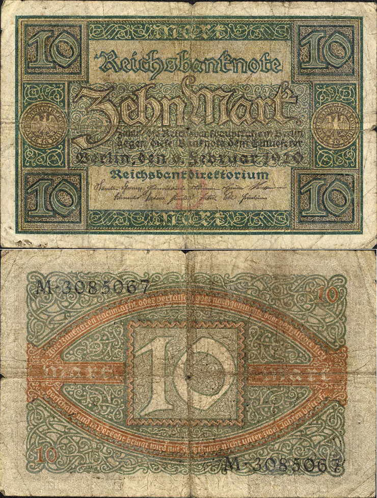 10 Mark; 6.2.1920; Grabowski DEU-73.a (63.a); Vs. und Rs.: Ornamente; Wz.: Wertzahl 10, Quadrate und Sechsecke; Kn 7stellig mit roten Udr.-Bst.: A-H, J, K; Serien A-Z |