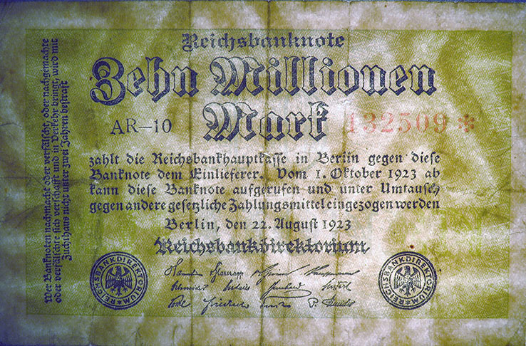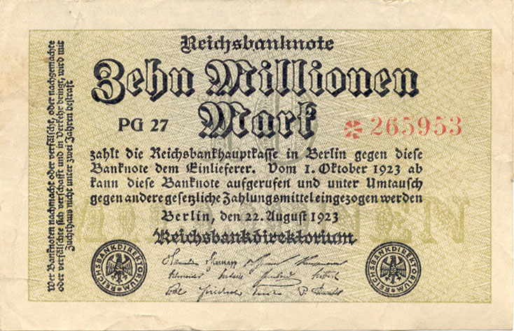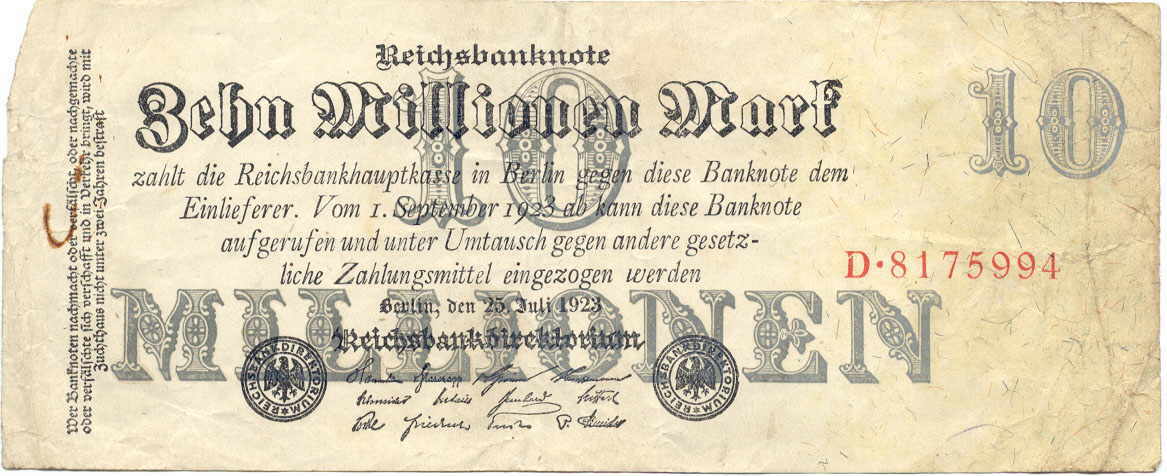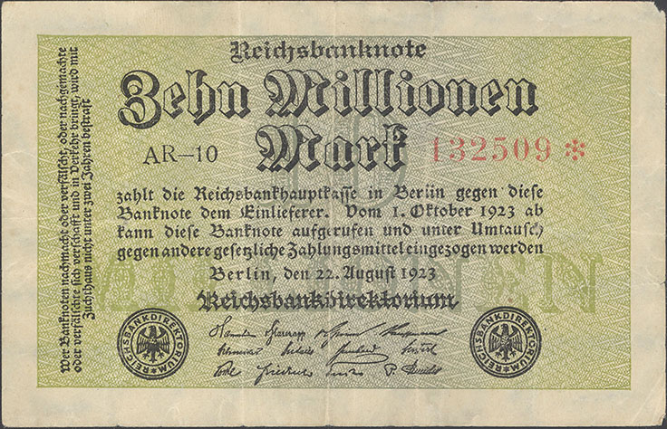 10.000.000 Mark; 25.7.1923; Grabowski DEU-107 (95.); Vs.: Text auf Wertangabe im Udr.; Rs.: leer; Wz.: Diestelstreifen; Serien: A-H |