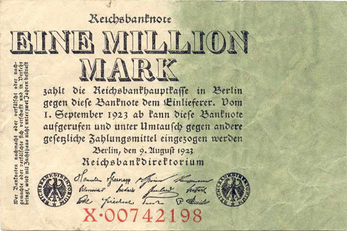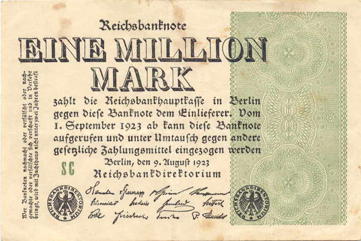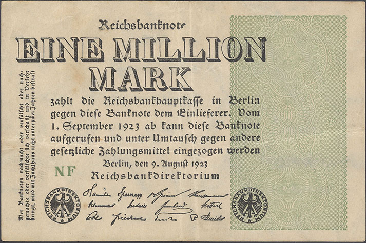 1.000.000 Mark; 9.8.1923; Grabowski DEU-113 (100.); Vs.: Text; Rs.: leer; Wz.: Eichenlaubstreifen; rechts das Papier grün eingefärbt; Wz. Eichenlaub; Serien: S-Z |