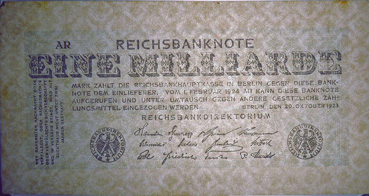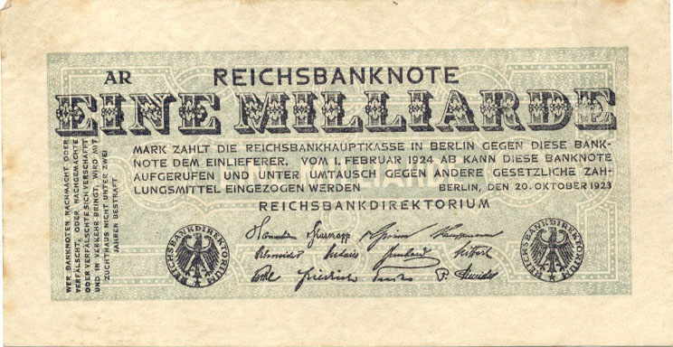 1 Milliarde Mark; 20.10.1923; Grabowski DEU-144.a (119.a); Vs.: Text auf Ornamenten mit Wertangabe; Rs.: leer; Wz. Kreuzblüten; Privatfirmendruck; FZ: AR |