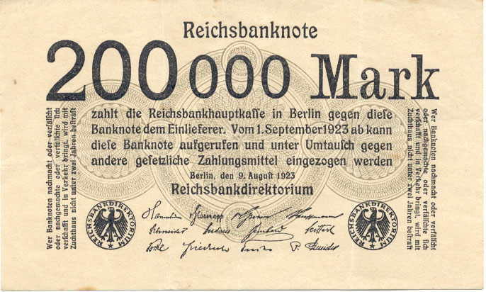 200.000 Mark; 9.8.1923; Grabowski DEU-111.b (99.b); Vs.: Text auf Ornamenten; Rs.: leer; ohne Wz.; Privatfirmendruck |