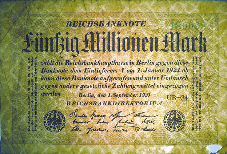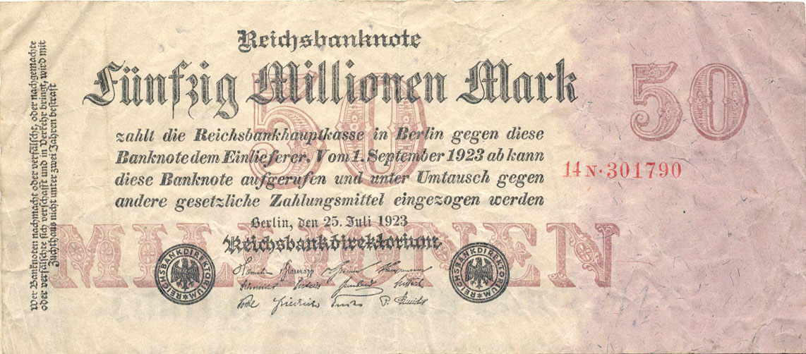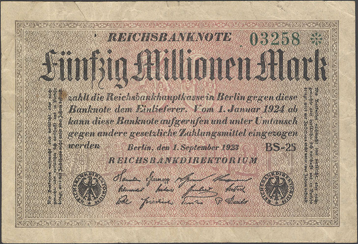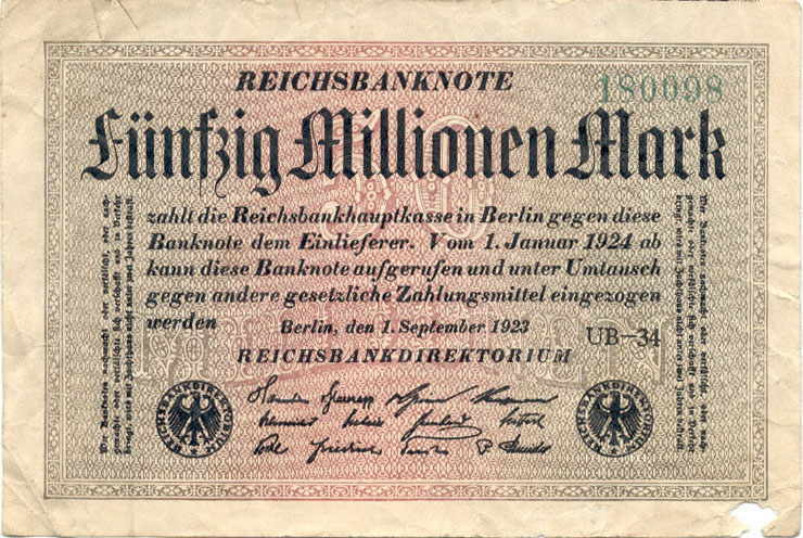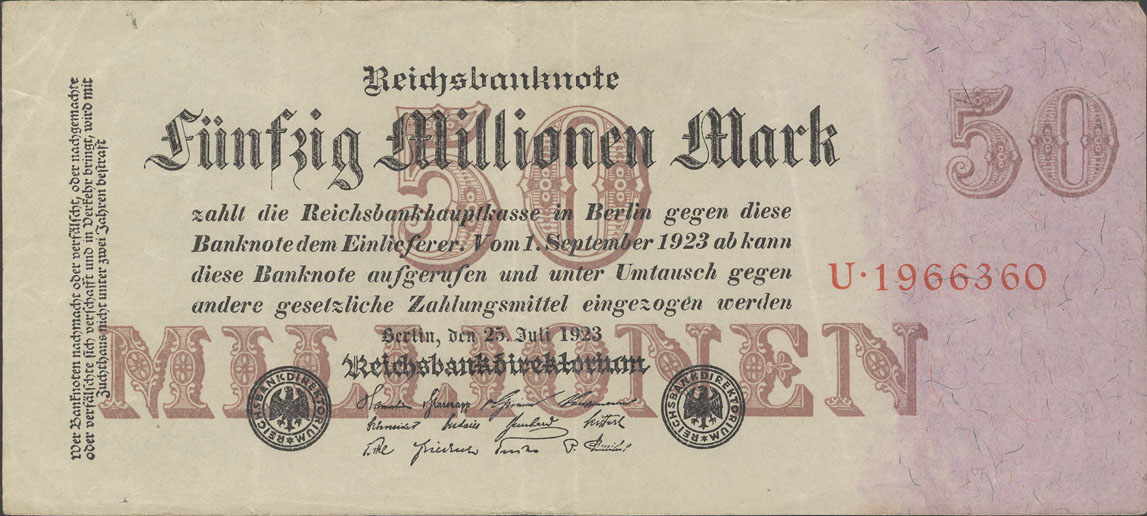 50.000.000 Mark; 25.7.1923; Grabowski DEU-109.a (97.a); Vs.: Text auf Wertangabe im Udr.; Rs.: leer; Wz.: Eichenlaubstreifen; Reichsdruckerei; Kn. 7-stellig; Serien: R-Z |