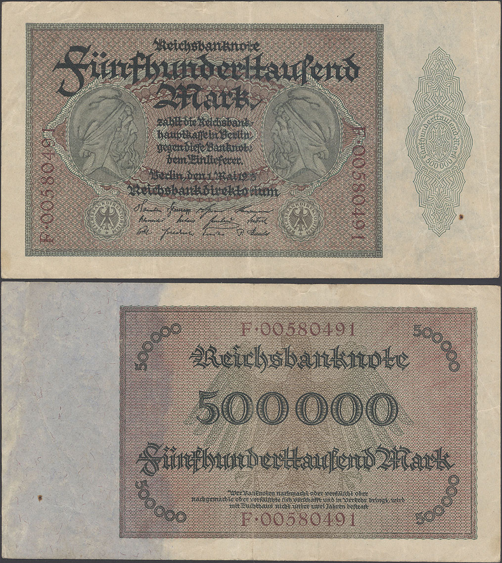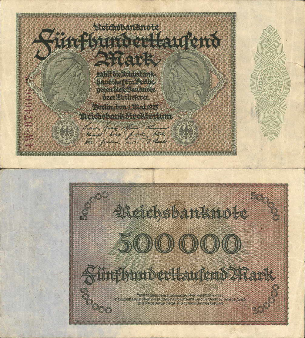 500.000 Mark; 1.5.1923; Grabowski DEU-99.b (87/P88); Vs.: 2 Kopfmedaillons eines bärtigen Mannes gegeneinander; Rs.: Wertangabe, darunter Adler; Wz.: "500 M" im Spiralband; Kn. 8-stellig, zweimal auf der Vs. und Rs.; FZ: F |