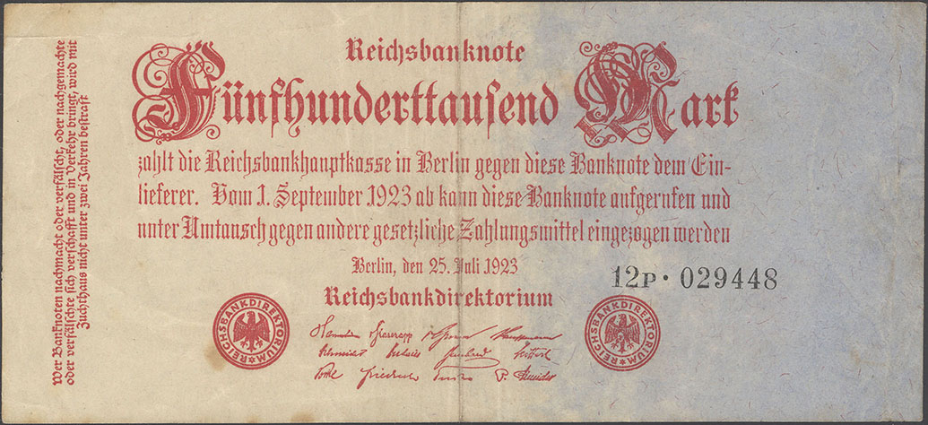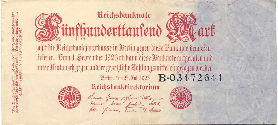 500.000 Mark; 25.7.1923; Grabowski DEU-103.a (91.a); Vs.: Text; Rs.: leer; Wz.: "500 M" im Spiralband; Serien: A-C; Reichsdruckerei |