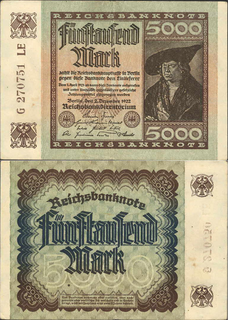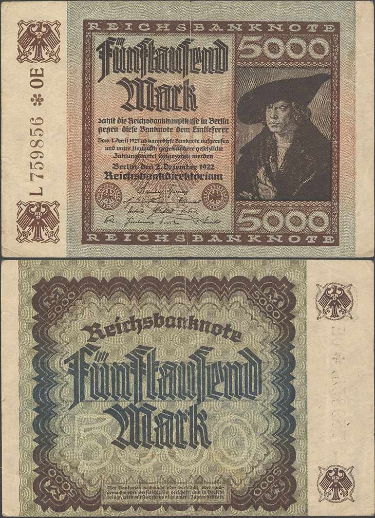 5.000 Mark; 2.12.1922; Grabowski DEU-91.f (80.a); Vs.: Kaufmann Imhoff (Gemälde von A. Dürer); Rs.: Wertangabe in einem Rahmen; nur Privatfirmendrucke; Wz. Hakensterne; Kn. 6-stellig |