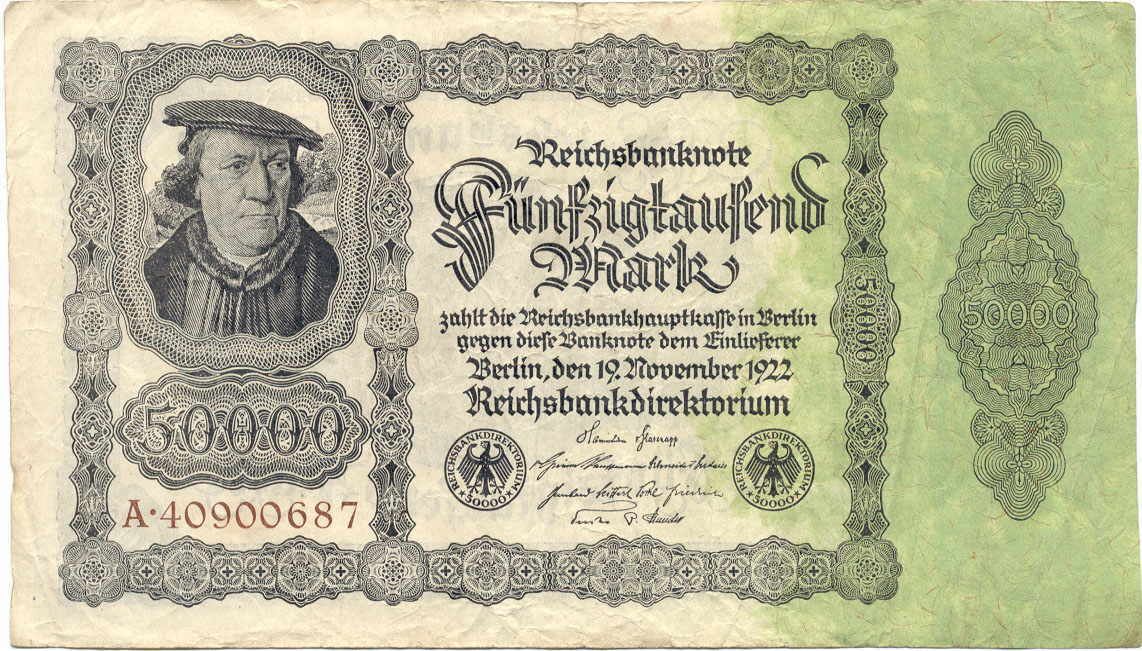 50.000 Mark; 19.11.1922; Grabowski DEU-90.a (79.a); Vs.: Bürgermeister Brauweiler (Gemälde von B. Bruyn); Rs.: Wertangabe auf Ornament; Wz.: Eichenlaubstreifen; Serien: A, B, G, H; Kn. braun |