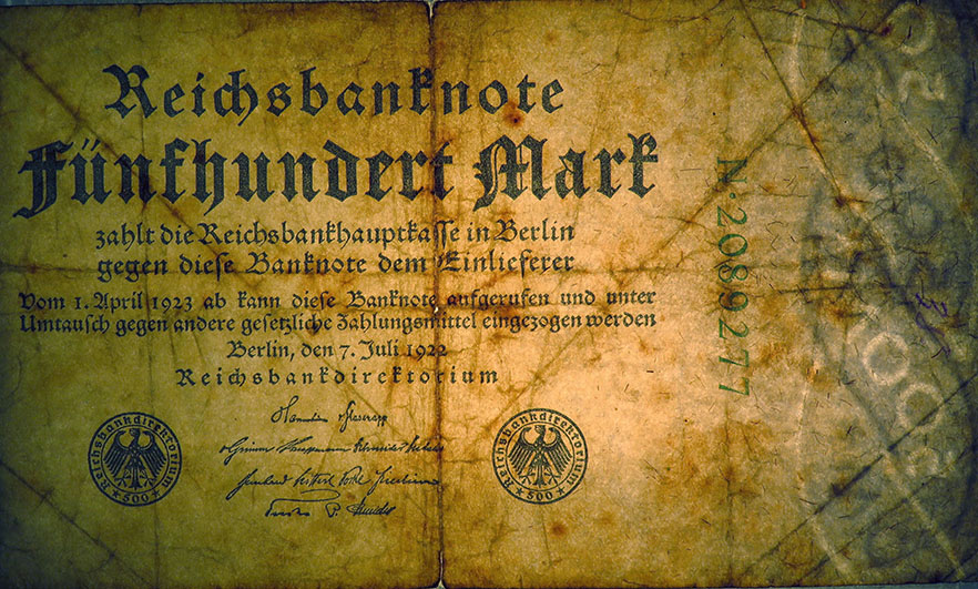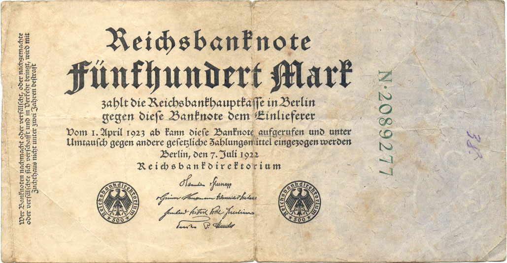 500 Mark; 7.7.1922; Grabowski DEU-82.a (71.b); Vs.: Text, Einlösung bis 1.4.1923; Rs.: leer; Wz.: "500 M" im Spiralband; Kn grün, 7-stellig; Serien: A-Z |