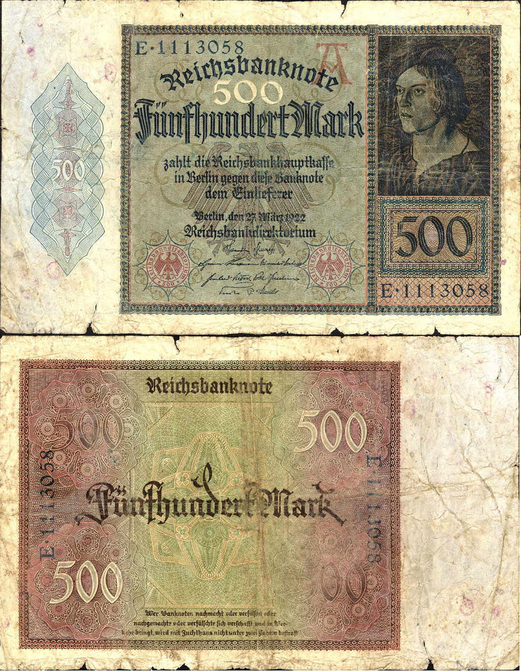 500 Mark; 27.3.1922; Grabowski DEU-80 (70.); Vs.: Junker J. Mayer; Rs.: Ornamente; Wz.: "500 M" im Spiralband; Serien: A-E; Udr.-Bst. A |
