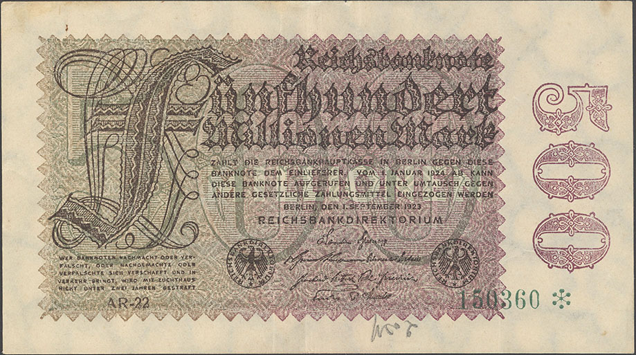 500.000.000 Mark; 1.9.1923; Grabowski DEU-125.h (109.d); Vs.: Text auf Muster mit Wertangabe; Rs.: leer; Wz. Hakensterne; Privatfirmendruck; Kn. 6-stellig |