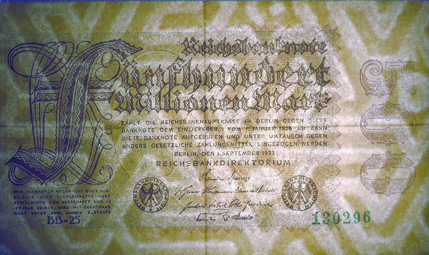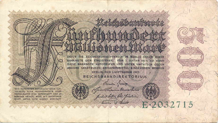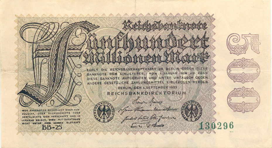 500.000.000 Mark; 1.9.1923; Grabowski DEU-124 (109.a); Vs.: Text auf Muster mit Wertangabe; Rs.: leer; Wz.: Diestelstreifen; Reichsdruckerei; Serien: A-M |