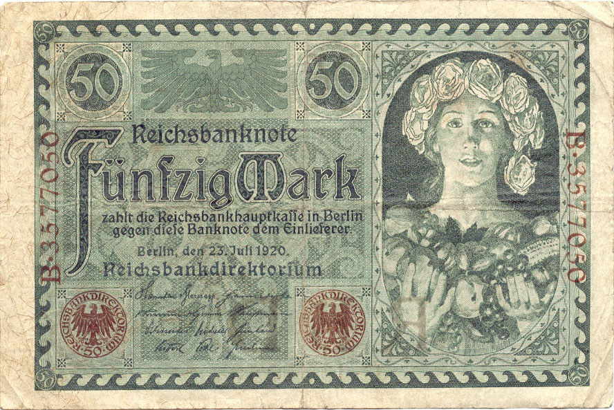 50 Mark; 23.7.1920; Grabowski DEU-74 (66.); Vs.: Mädchenkopf, Blumen und Früchte; Rs.: Bauer und Arbeiter; Wz.: Wertzahl 50 in Ornamenten; Serien: A-C; Udr.-Bst.: U-X |