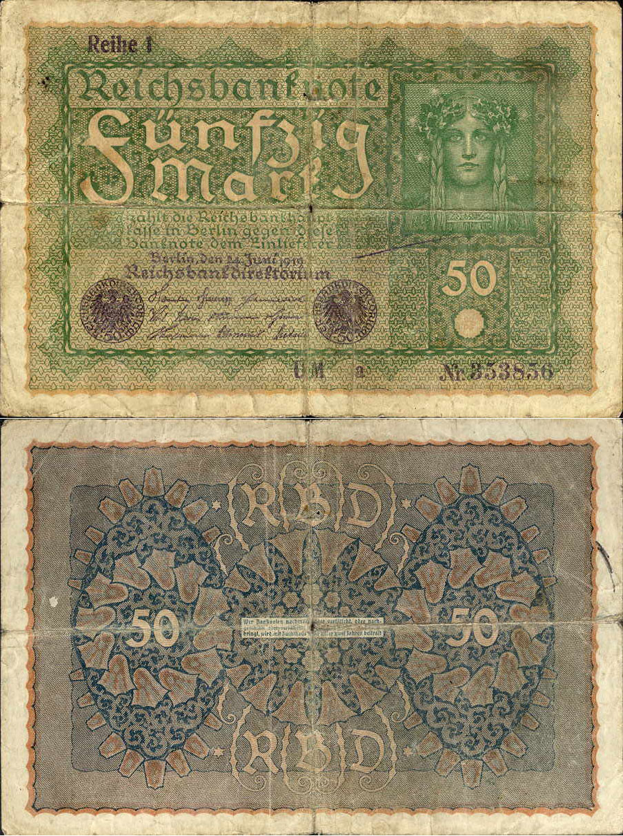 50 Mark; 24.6.1919; Grabowski DEU-71.a (62.a); Vs.: Mädchenkopf; Rs.: RBD und Wertziffer in Ornamenten; ohne Wz.; Serien-Kleinbuchstaben: a, c, d, g, k, davor Großbuchstaben: ... UM ... |