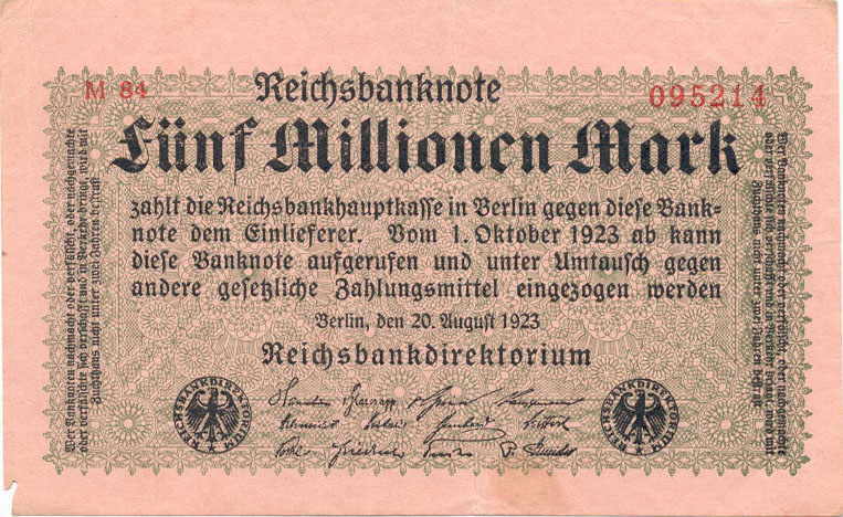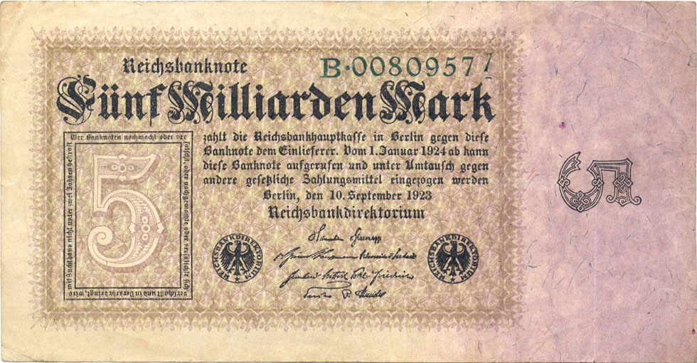 5 Milliarden Mark; 10.9.1923; Grabowski DEU-132.a (112.a); Vs.: Text auf Muster mit Wertangabe; Rs.: leer; Wz. Eichenlaubstreifen; Reichsdruckerei; Serien: A-D |