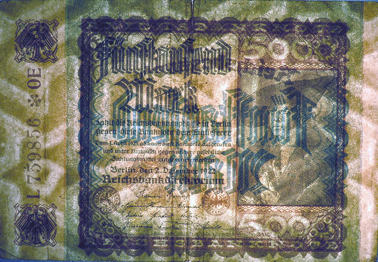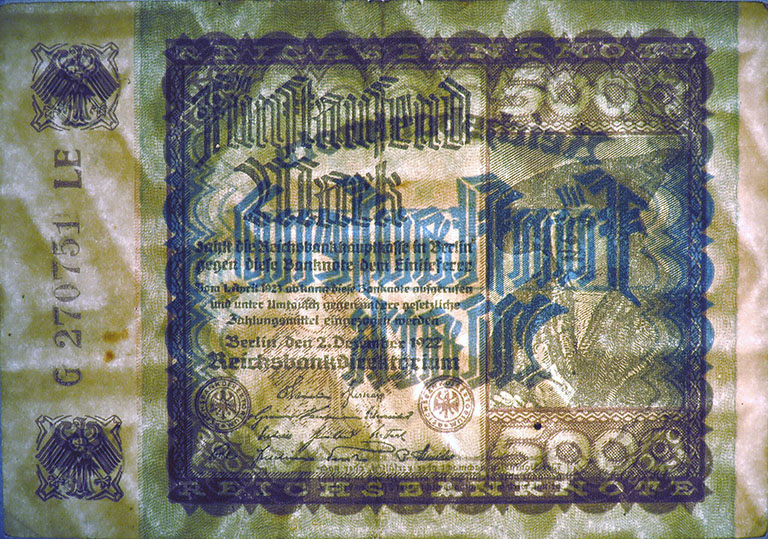 5.000 Mark; 2.12.1922; Grabowski DEU-91.f (80.a); Vs.: Kaufmann Imhoff (Gemälde von A. Dürer); Rs.: Wertangabe in einem Rahmen; nur Privatfirmendrucke; Wz. Hakensterne; Kn. 6-stellig mit 6-zackigem Stern hinter der KN Anmerkung: Die KN ist in der Literatur falsch oder unvollständig beschrieben. |