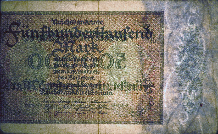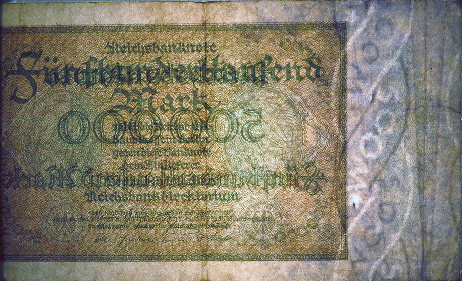 500.000 Mark; 1.5.1923; Grabowski DEU-99.f (87/P88); Vs.: 2 Kopfmedaillons eines bärtigen Mannes gegeneinander; Rs.: Wertangabe, darunter Adler; Wz.: "500 M" im Spiralband; Kn. 6-stellig mit 6-zackigem Stern hinter der KN, nur einmal auf der Vs.; FZ: W Anmerkung: Die KN ist in der Literatur falsch oder unvollständig beschrieben. |