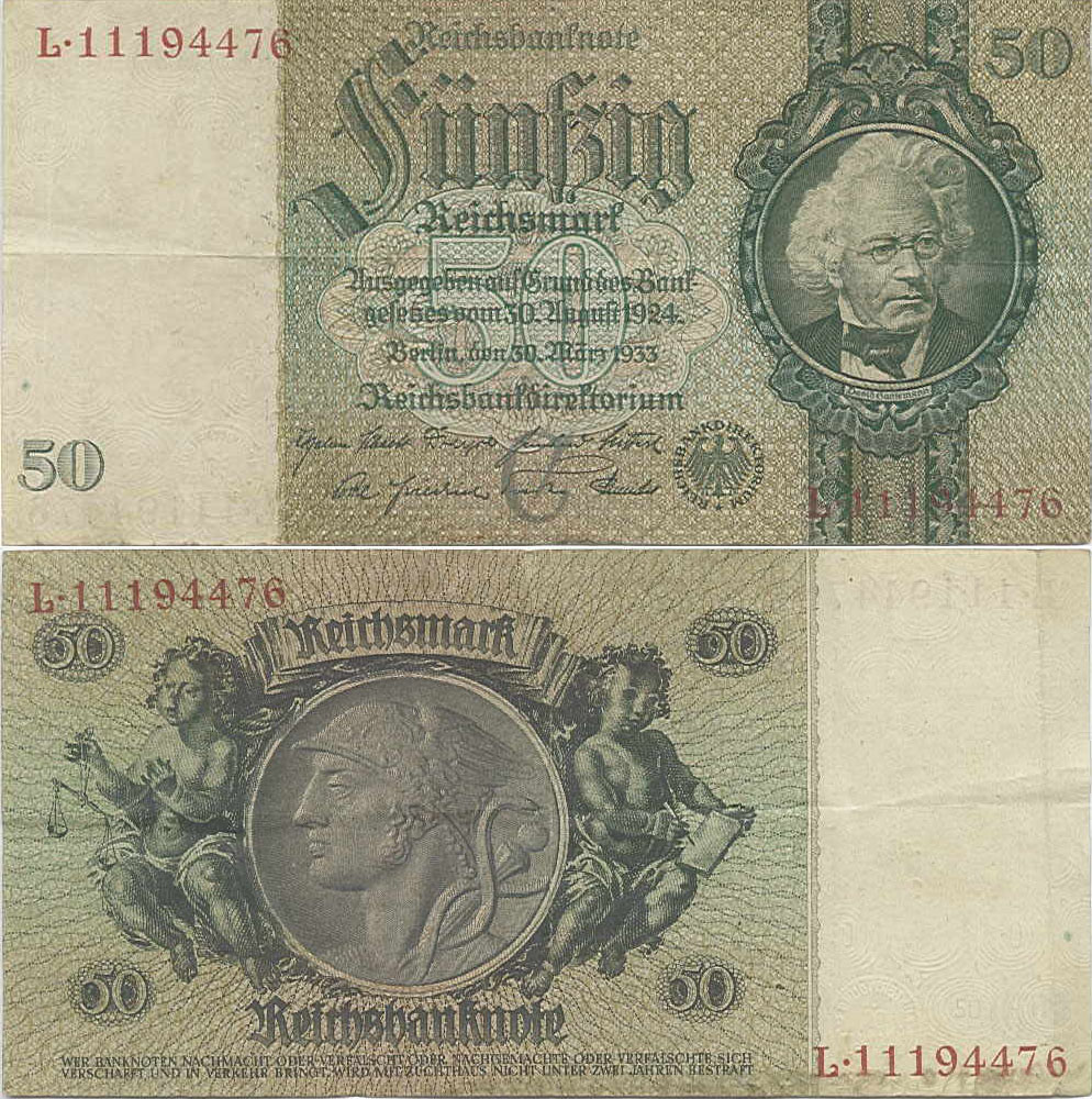 50 Reichsmark; 30.3.1933; Grabowski DEU-210 (175/P182.b); Vs.: David Hansemann; Rs.: von Putten eingerahmte Medaille mit Merkurkopf, den Handel symbolisierend; Wz.: Kopf von Hasemann; Kn von rot bis dunkelbraunrot; Serien A-U; Udr.-Bst.: C |
