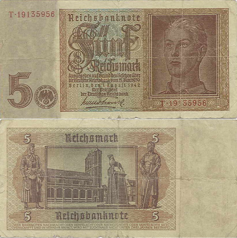 5 Reichsmark; 1.8.1942; Grabowski DEU-220.b (179/P186.b); Vs.: Jünglingskopf; Rs.: Löwendenkmal vor dem Braunschweiger Dom; Wz.: Wertzahl "5"; Serien A-Z; Udr.-Bst.: P; Kn 8-stellig |