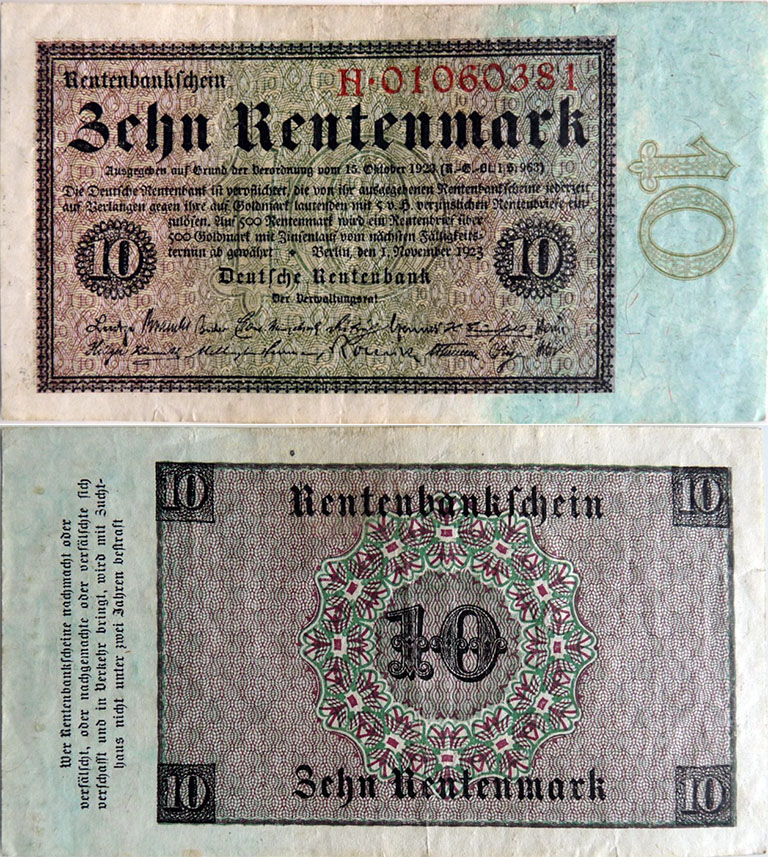 10 Rentenmark; 1.11.1923; Grabowski DEU-202 (157/P164); Vs.: Text im Rahmen auf Udr. mit Wertzahl; Rs.: Wert auf Ornamenten; Wz.: Kreuzringelmuster; KN 8-stellig, rot |