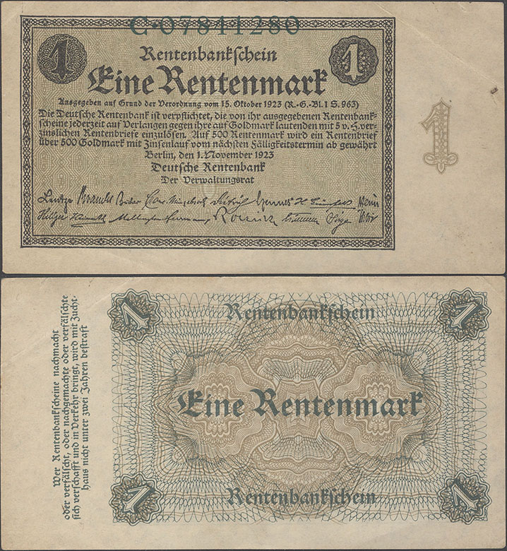 1 Rentenmark; 1.11.1923; Grabowski DEU-199 (154/P161); Vs.: Text im Rahmen auf Udr. mit Wertzahl; Rs.: Wert auf Ornamenten; Wz.: Kreuzringelmuster; KN dunkelgrün |