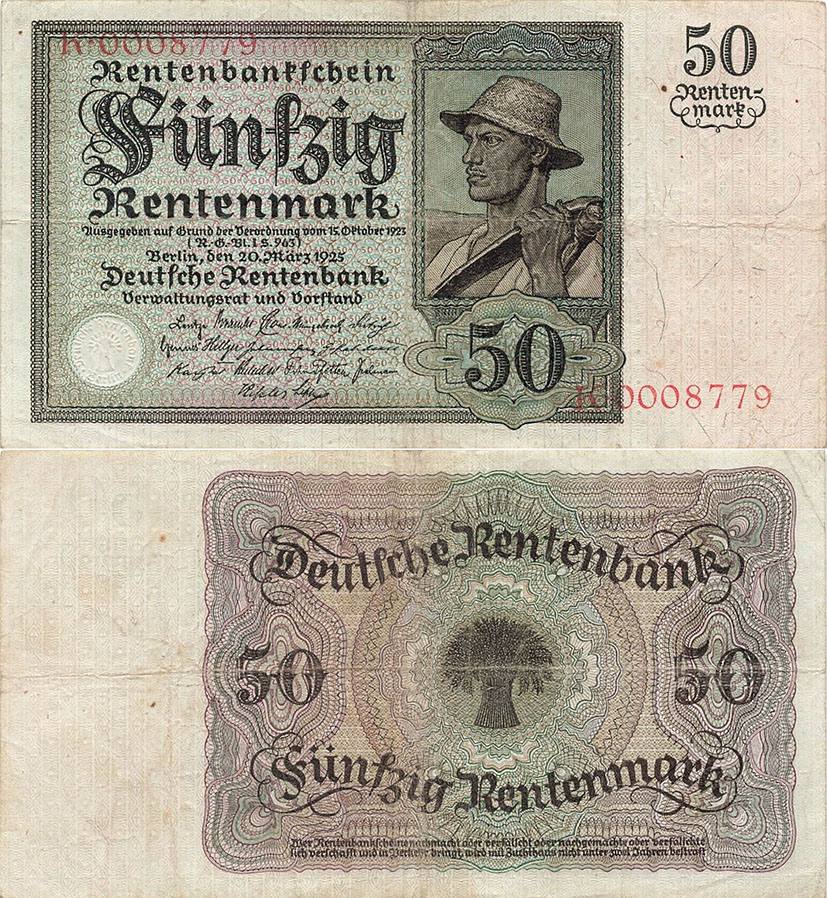 50 Rentenmark; 20.3.1925; Grabowski DEU-207 (162/P171); Vs.: Bauer mit Sense; Rs.: Ährengarbe in Ornamenten; Wz.: Eichenlaubstreifen; KN 7-stellig, rot |