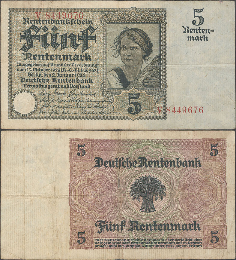 5 Rentenmark; 2.1.1926; Grabowski DEU-209 (164/P169); Vs.: Bauernmädchen mit Getreidegarbe; Rs.: Ährengarbe in Ornamenten; Wz.: Ähren und Kornblumen; KN rot |
