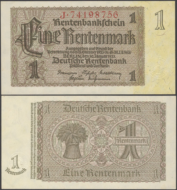 1 Rentenmark; 30.1.1937 (erst ab 5.9.1939 ausgegeben); Grabowski DEU-222.b (166/P173.b); Vs.: Text auf Ornamenten mit Wertzahl; Rs.: Ährengarbe und Wertangabe in Ornamenten; Wz.: Kleinkaro (Karos und Ringe); Kn 8-stellig, rot; Reichsdruckerei |