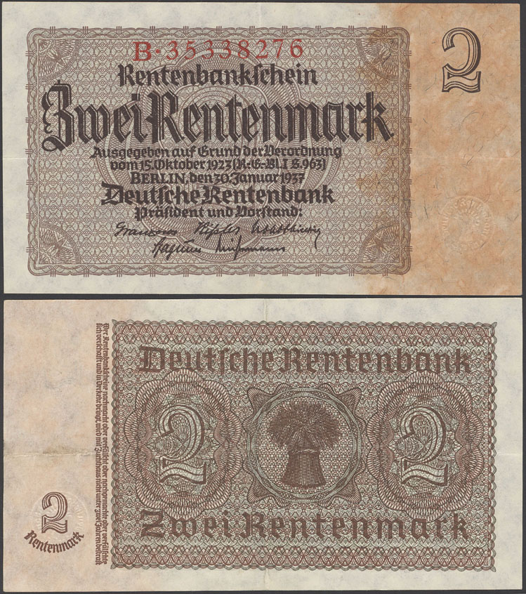 2 Rentenmark; 30.1.1937 (erst ab 5.9.1939 ausgegeben); Grabowski DEU-223b (167/P174.b); Vs.: Text auf Ornamenten mit Wertzahl; Rs.: Ährengarbe und Wertangabe in Ornamenten; Wz.: Kreuzball (Andreaskreuze und Kreise); Kn 8-stellig, rot; Reichsdruckerei |
