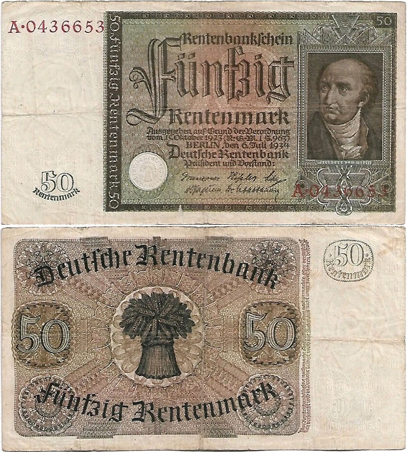 50 Rentenmark; 6.7.1934; Grabowski DEU-221 (165/P172); Vs.: Brustbild des Freiherrn Karl von und zum Stein; Rs.: Ährengarbe in Ornamenten; Wz.: Kopfbildnis des Freiherrn Karl von und zum Stein; Kn 7-stellig, rot; Reichsdruckerei |