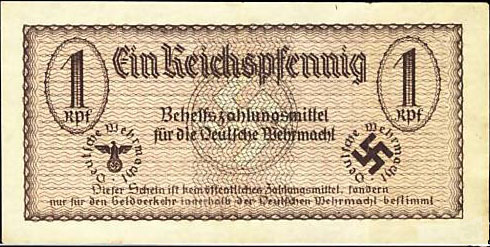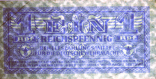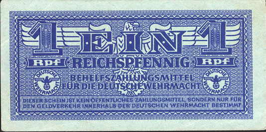 1 Reichspfennig; o. D. (ab 1940); Grabowski DWM-1 (500/M31.); Druckfarbe dunkelbraun, auch rosa; Papier weiß oder gelblich; Udr. Hakenkreuz; Wz. Krone über Blütenornament; ohne KN; "Behelfszahlungsmittel für die Deutsche Wehrmacht“ |