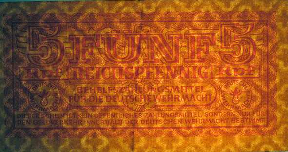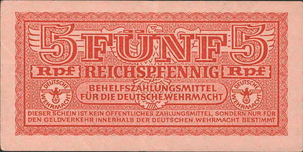 5 Reichspfennig; o. D. (ab 1942); Grabowski DWM-3 (502/M33.); Druckfarbe rot; Papier rosa; Udr. Adler mit Hakenkreuz; Wz. Kreuzblüten; ohne KN; "Behelfszahlungsmittel für die Deutsche Wehrmacht“ |