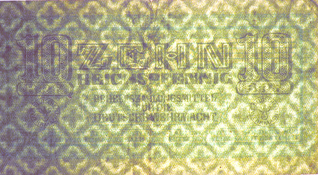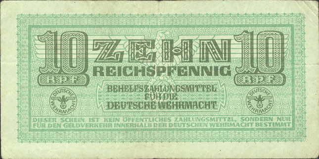 10 Reichspfennig; o. D. (ab 1942); Grabowski DWM-4 (503/M34.); Druckfarbe grün; Papier grünlich; Udr. Adler mit Hakenkreuz; Wz. Kreuzblüten; ohne KN; "Behelfszahlungsmittel für die Deutsche Wehrmacht“ |